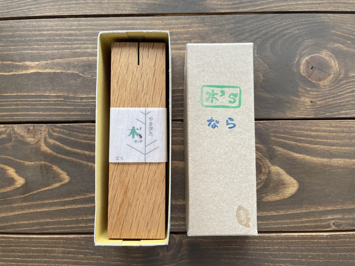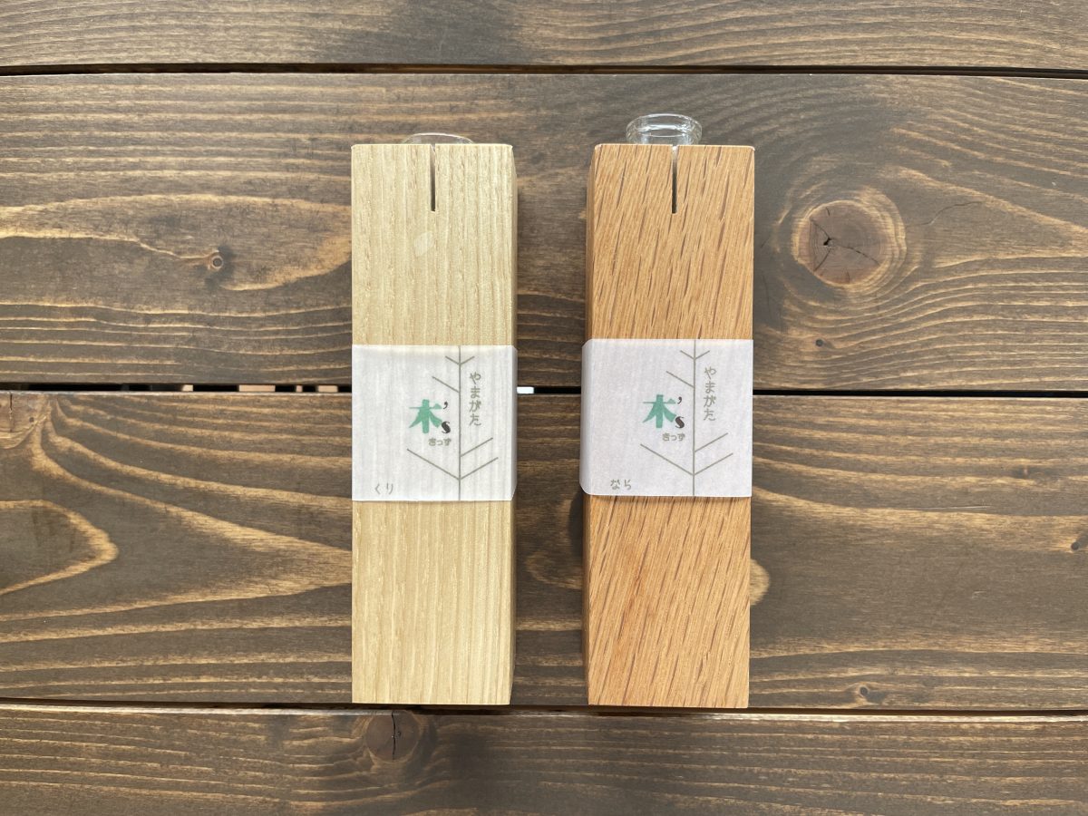 ゆずりはは、「日々の暮らしのなかで使えるもの」をテーマに、青森、秋田、岩手の3県をはじめ、東北の手作りアイテムをセレクトしているショップで、この一輪挿し用花瓶は、山形県の「家具工房モク」のもの。いくつかある木の種類から、まず選んだのは、山でなじみのある「なら」を。