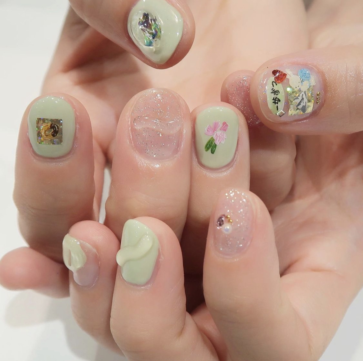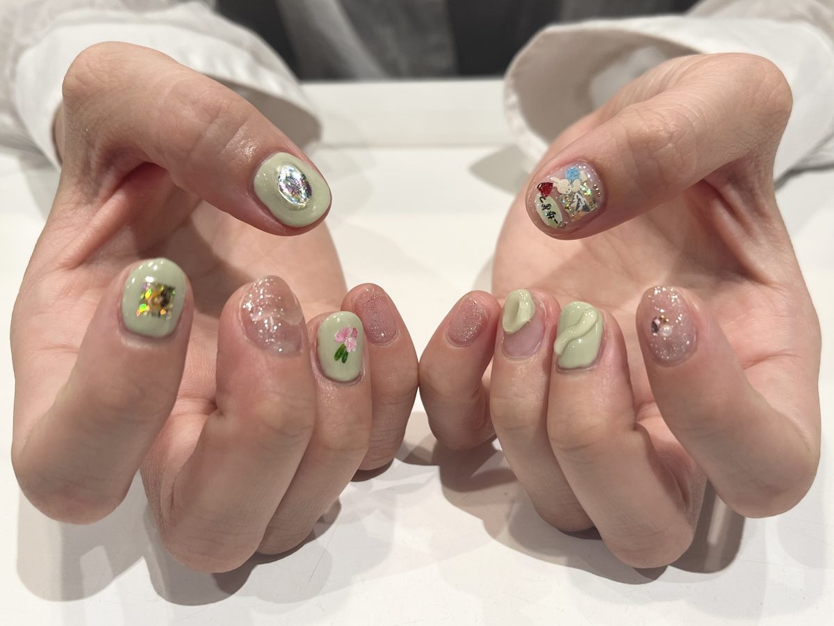 今回は、新緑の緑と山で見た植物、食べたい行動食を掛け合わせたネイル。新緑の緑を再現しすぎるとあまり肌になじまない色になってしまったので、少しなじませたグリーンに。夏をイメージして、クリアラメベースも入れました◎