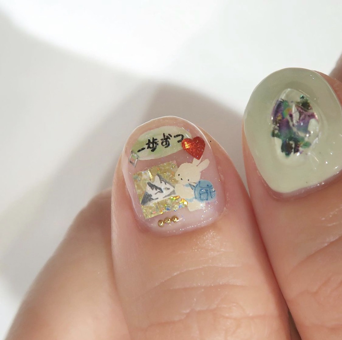 いちばんのお気に入りは左手の親指!スマホの裏にステッカーをぺたぺた貼っているイメージで、山・バックパックを背負っているウサギを描いてもらい、「一歩ずつ」という言葉もステッカー風にあしらってもらいました。ほんのり入っているラメもかわいくて、毎日のように眺めてはにんまりしています。