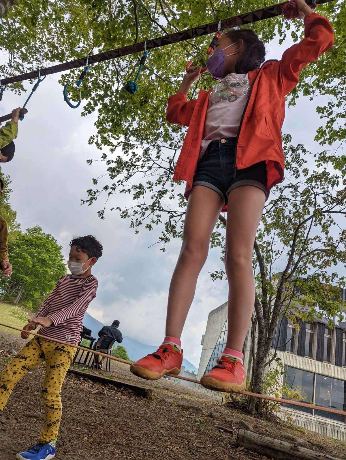 散策ができたり、スラックラインやブランコがあったり。リフトに乗って新エリア「白馬ヒトトキノモリ」へ行く