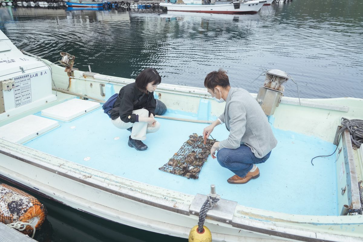 松山空港から車を走らせて約1時間30分。ジュエリーデザイナーの宮田有理さんは宇和島城から市街を眺めて、海と山の近さに息を吞んだ。この日訪れたのは、養殖からアクセサリー加工、販売までを一貫して手がけるヤマシタパール。「海では海藻やクラゲが泳いでいて、海のなかにも森が広がっているんだなぁ」とわくわくしながら話す有理さん。海に浮かぶ養殖の仕事場を見学させてもらい、3代目代表の山下太さんからいろんなことを教えてもらった。