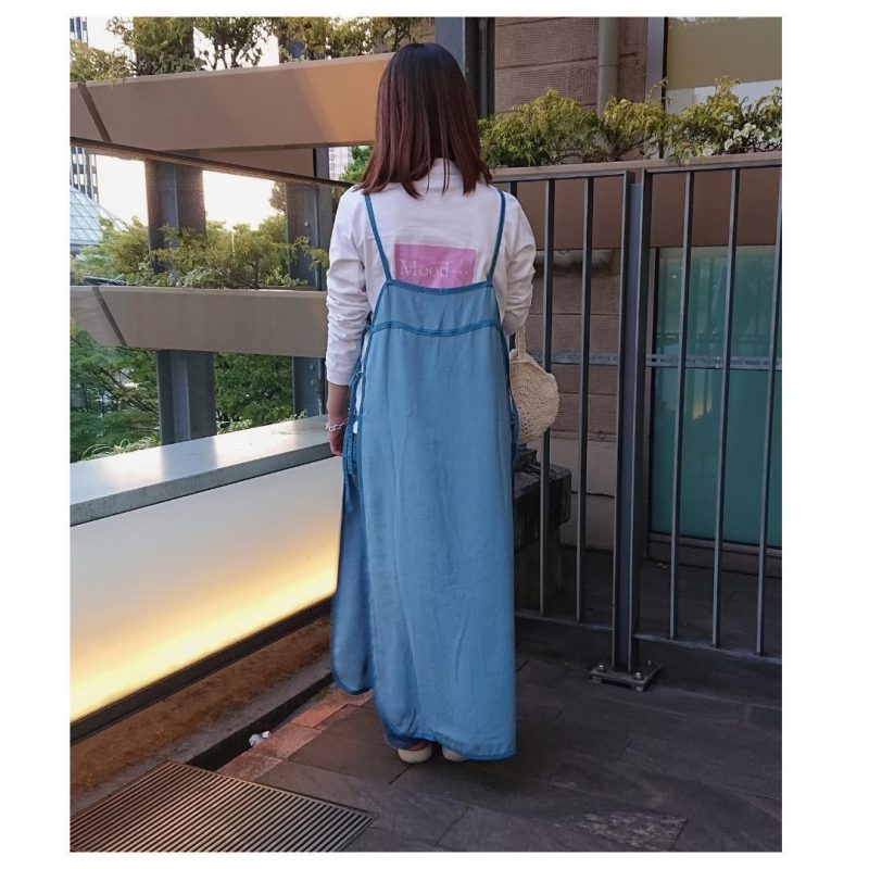 軽やかな素材でアースカラーのジャンパースカートが自然にマッチしています。夏でも夜は肌寒くなる場合があるので、腰に巻いたチェックシャツは実用的でありワンポイントにもなっていますね。