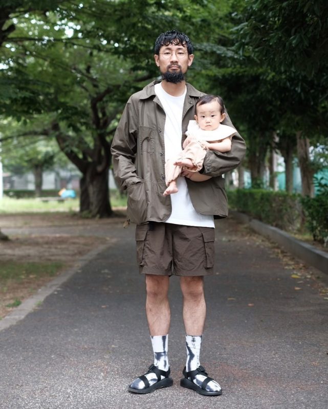 上下カーキのコーディネートは、キャンプなど自然の中ですっと馴染みますね。Tシャツとソックスを白系に統一して色数を抑え、サンダルで軽やかにすることで全体がシックに纏まった素敵な印象です。