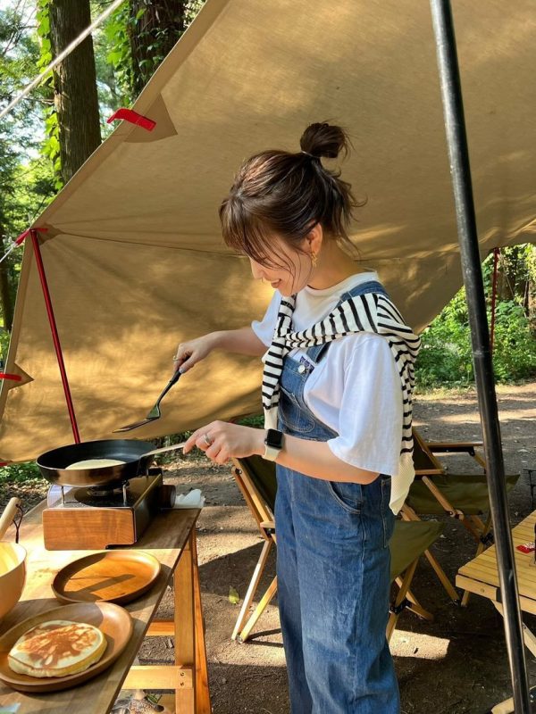 オーバーオールはリラックスしたいキャンプスタイルに合っていますね。丈夫なデニム素材は、キャンプでの色々な作業にもぴったりで、焚き火をする場合でも化繊素材より火の粉に耐えられます。