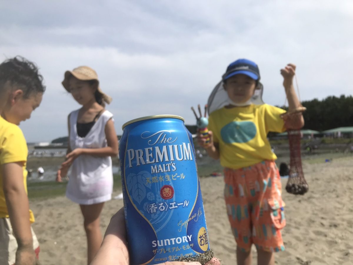 大人は早めに疲れて終了。ビーチで冷えたビールを1缶! めちゃくちゃおいしかった!