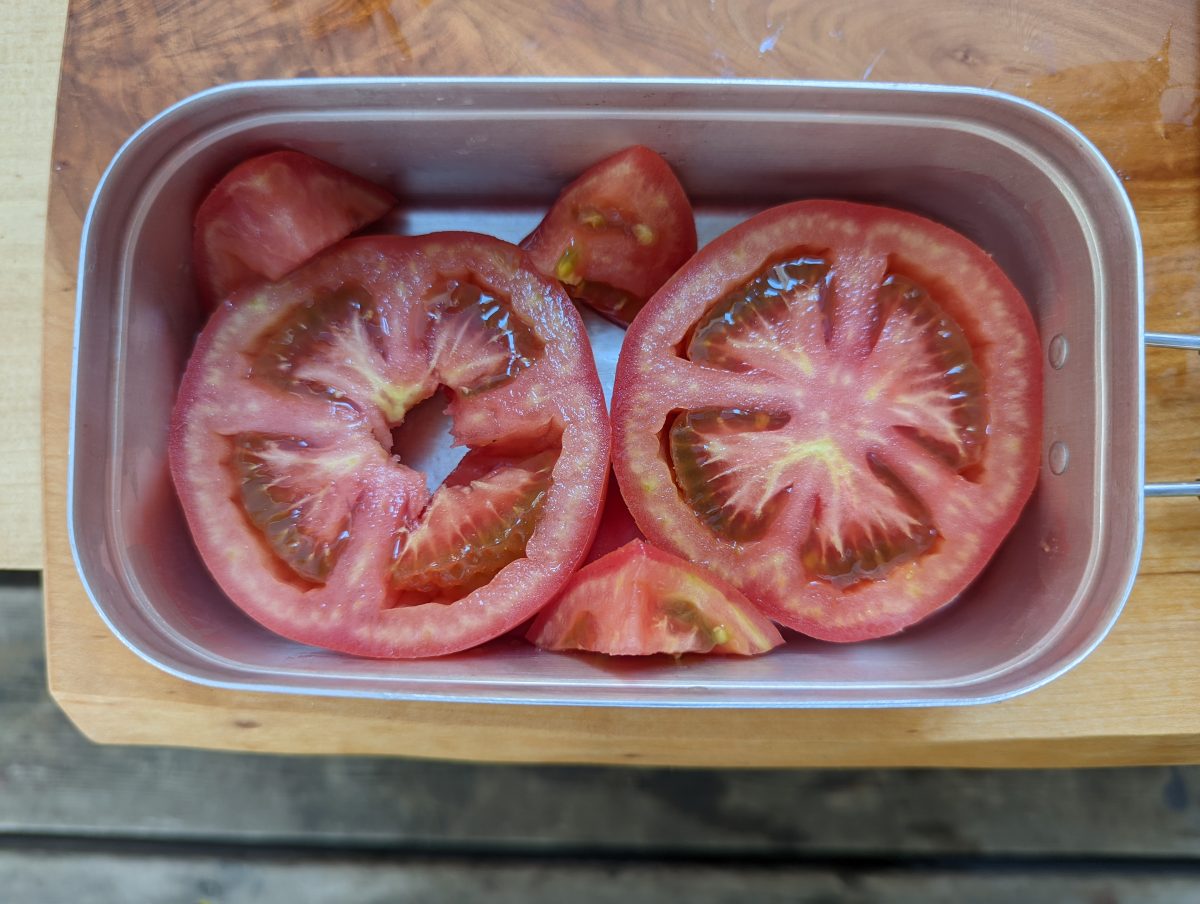 ②タマネギ、トマトを1.5cmくらいの輪切りにする。シイタケは石づきをとり、半分に切る。ニンニクは皮をむいておく。