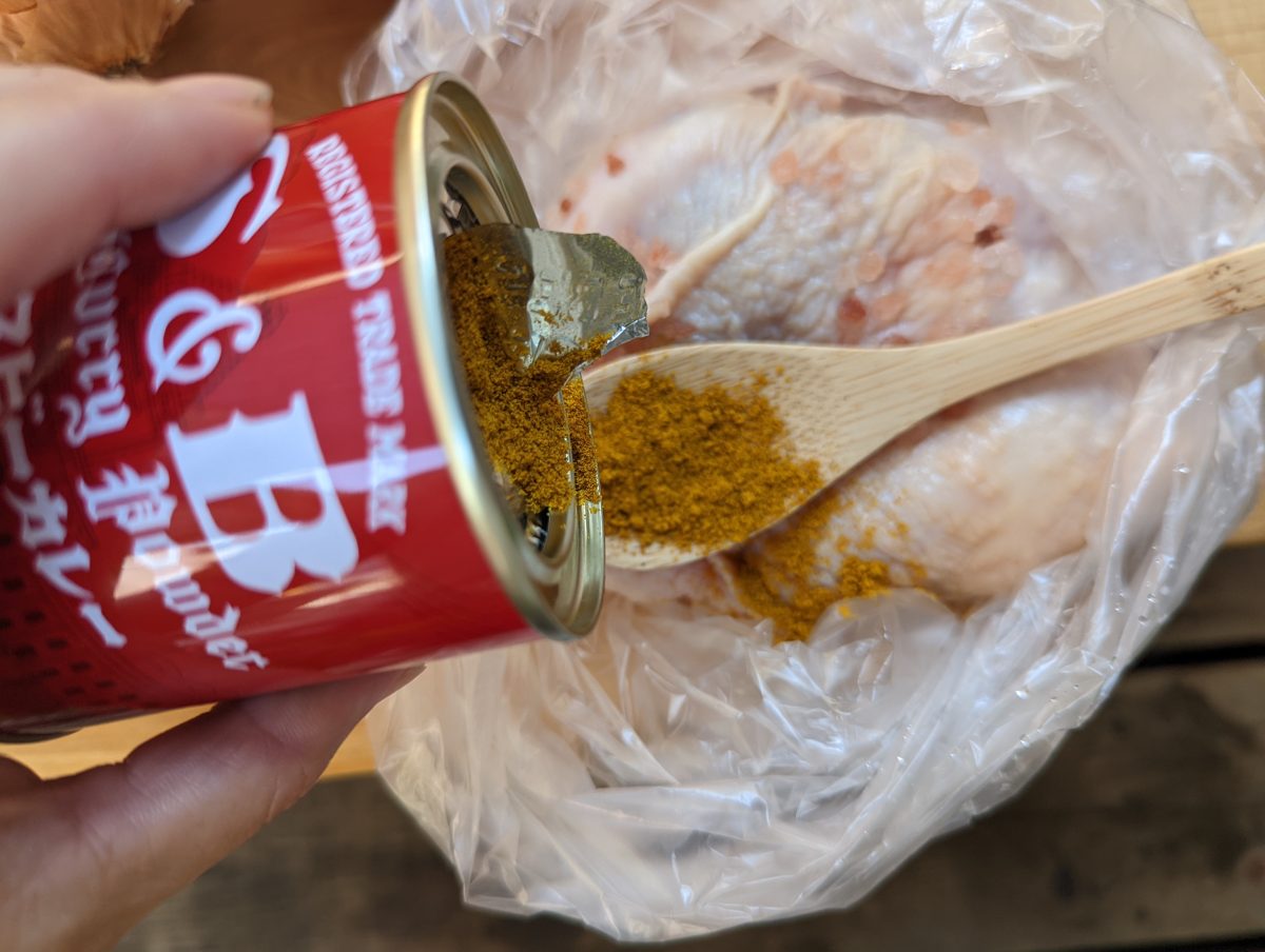 漬け込むときはジップロックよりビニール袋がオススメ。唐辛子が入っていないカレー粉を使うと、子どもも食べられる