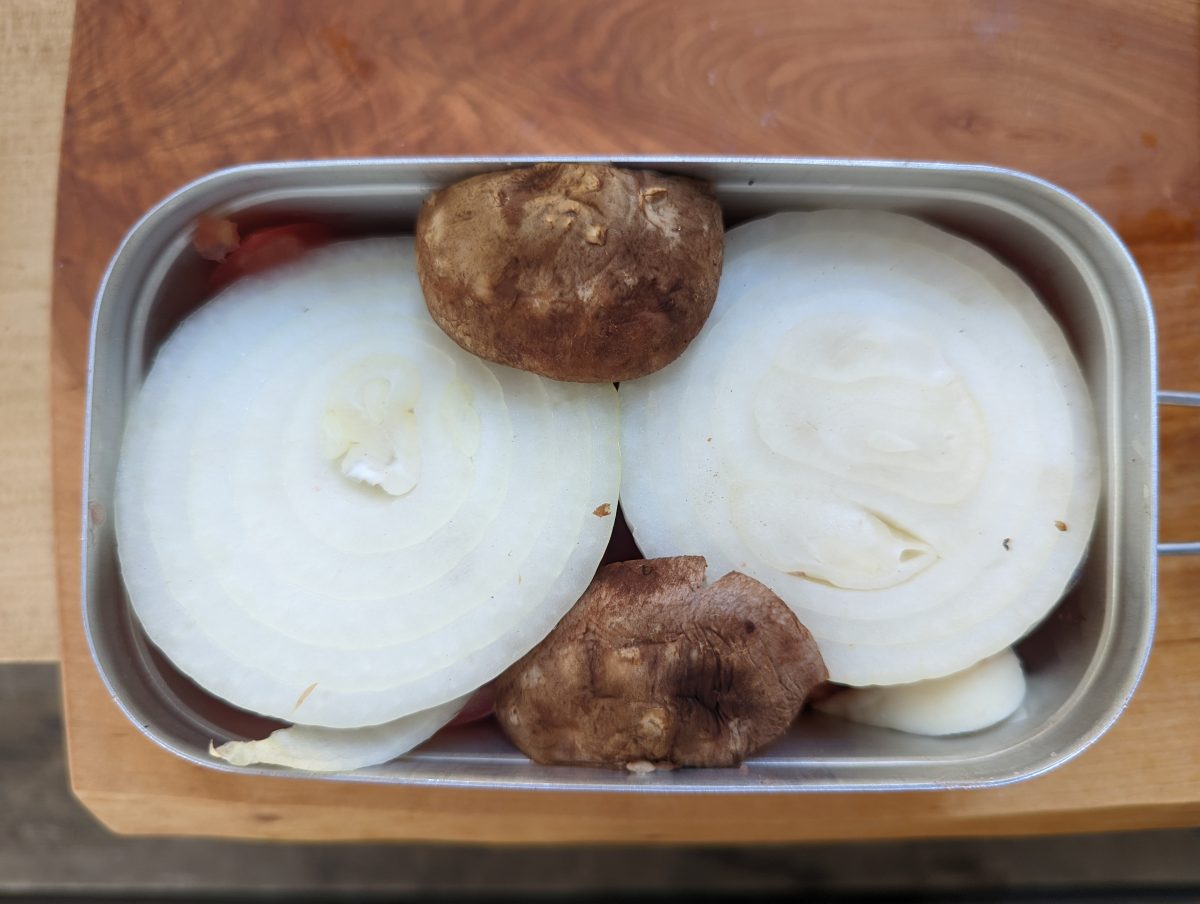 ②タマネギ、トマトを1.5cmくらいの輪切りにする。シイタケは石づきをとり、半分に切る。ニンニクは皮をむいておく。
