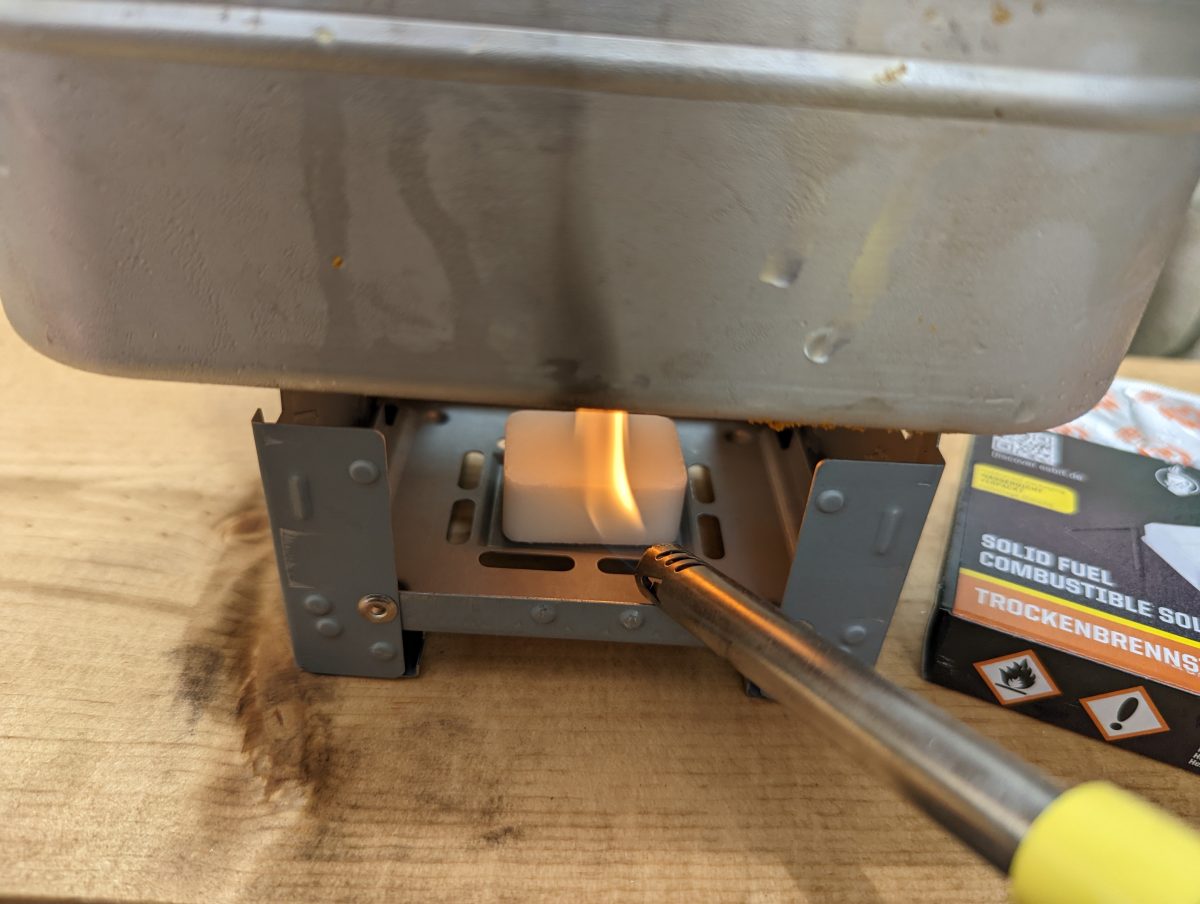 ④固形燃料に火をつけて、30~40分待つ(小さい固形燃料なら3~4個使用)。※バーナーなら極弱火で! 弱火で煮ることで自然と水分が出てくる。鶏肉に火が通れば完成!