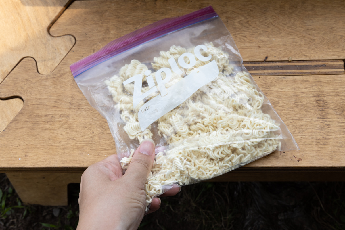 ジップロックが無い場合は袋麺を開封せずにそのまま砕いてしまってもOKですが、ジップロックに移した方が細かく砕きやすくて◎。