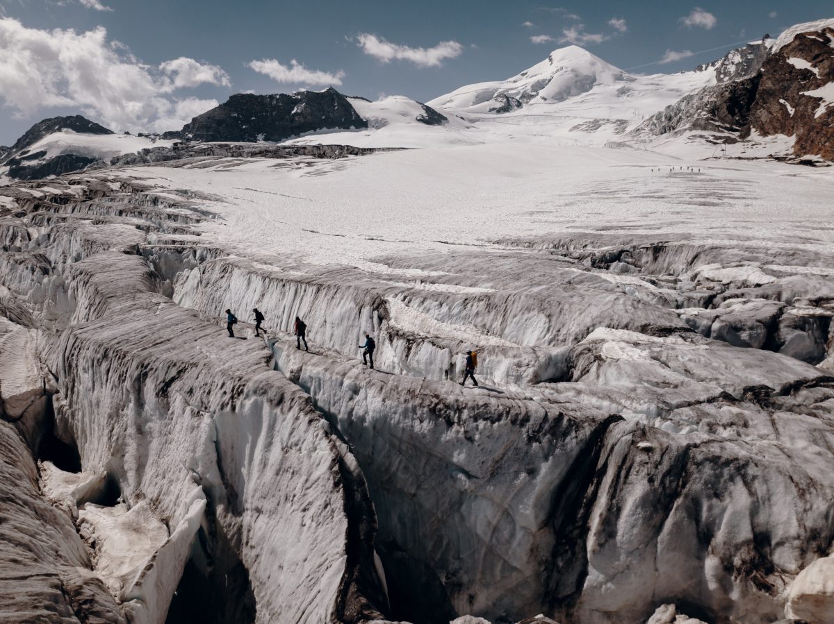 山岳観光地のサースフェーの標高は、村ですでに1,800mあり、静かな避暑地として人気です。村からシュピールボーデンへ向かうゴンドラに乗り、ロープウェイを経由して標高2,869mのレングフルーへ。ガイドが親切に登山靴とアイゼンの大きさを調節してくれるので、初めてアイゼンを履く人も安心です。ここでハーネスも装着して準備を整えます。