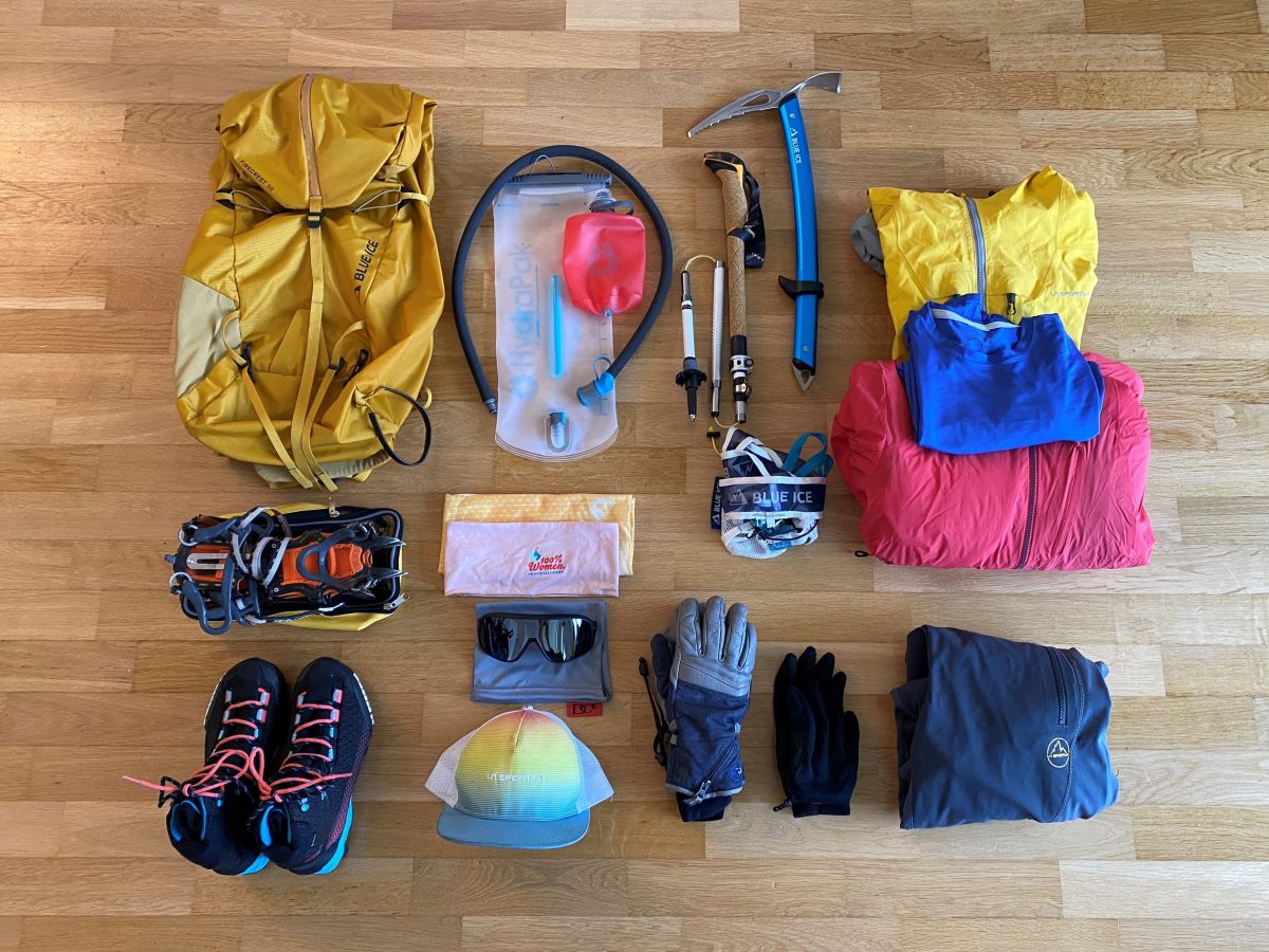 今回は、両日ともに風が弱く暖かな天候に恵まれたので、山ではソフトシェルのパンツ一枚とダウンジャケットで行動ができました。どんなウエアを着るかもガイドにアドバイスをもらうといいですよ。アイゼンやハーネス、ピッケルは現地でレンタルすることも可能。ストックは一本あると氷河でバランスを取って歩きやすく、姿勢が良くなり胸も広がるので呼吸が少し楽になります。折り畳み式タイプがコンパクトになり行動しやすいです。行動食はバックパックを下ろさずに取り出せるよう、ジャケットやバックパックのポケットにチョコレートやエネルギーバーなどを入れておくことをおすすめします。水は行動しながらも飲めるハイドレーションが便利です。