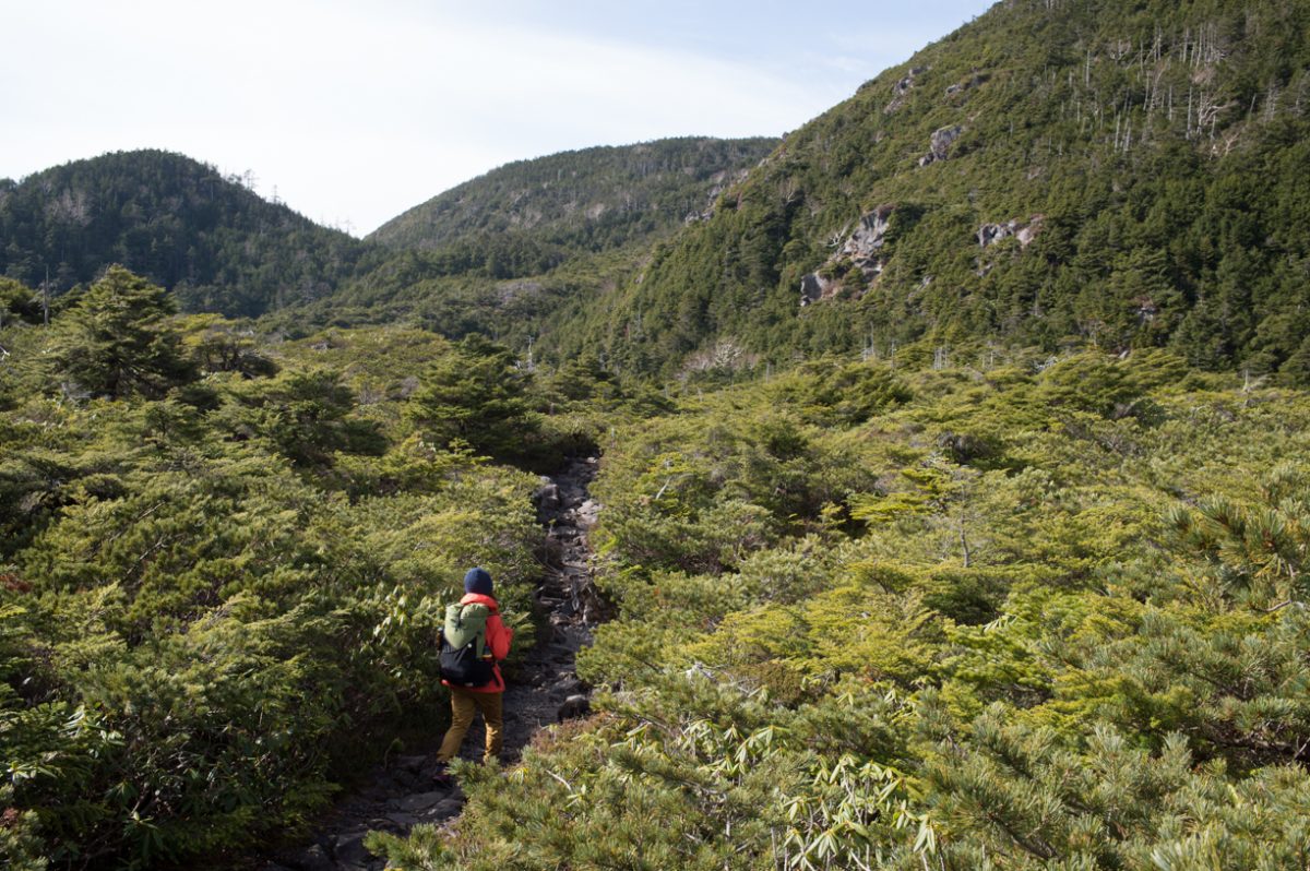 ウエアを着て目指すのは、北八ヶ岳にある北横岳。北八ヶ岳ロープウェイを利用して、山頂駅からスタート。ハイマツやコメツガの低木が立ち並ぶ坪庭を歩き、日本庭園のような美しさを持つ木々のあいだをすり抜けて山頂を目指します。