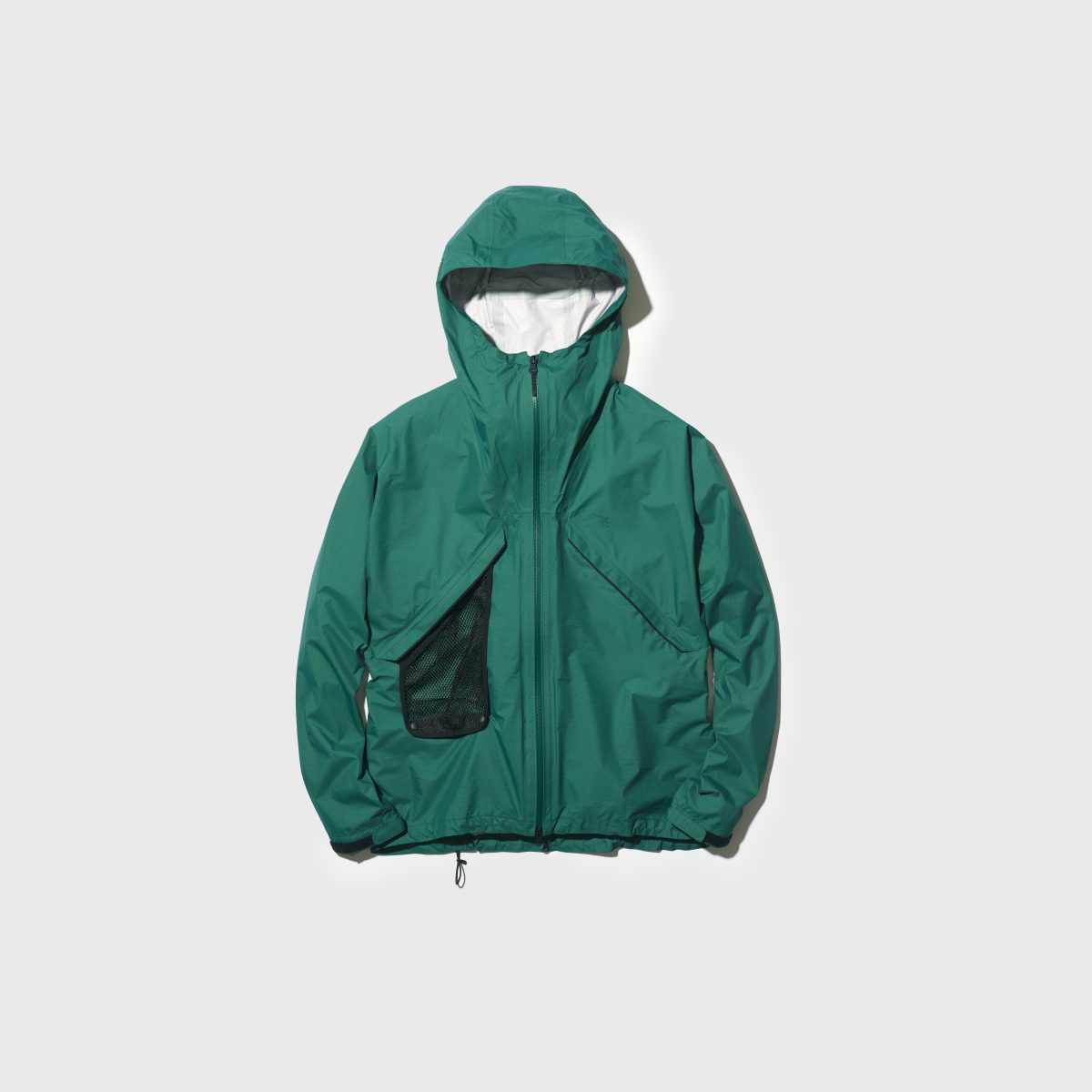 顔や顎にファスナーが干渉しないよう、斜めにデザインされたフロントファスナー、ヒジから袖まで大きく開くベンチレーションが特徴。センターのカンガルーポケットは、ジャケットタイプと同様に出し入れ可能なメッシュポケットなので、濡れたものを乾かしながら歩ける。