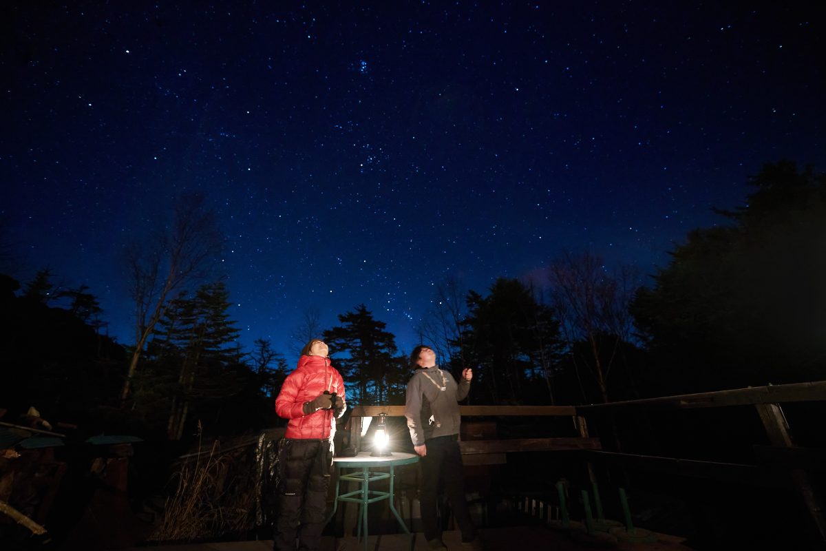 ツアーの日程は、夏の星座と冬の星座、両方をみることができるとっておきの週末。縄文時代と現代の星空に違いはあるのか? ご主人の木村さんによる解説を聞きながら、双眼鏡で夜空を観察します。静寂の大自然のなかで見る空は、街中では見ることができない風景。