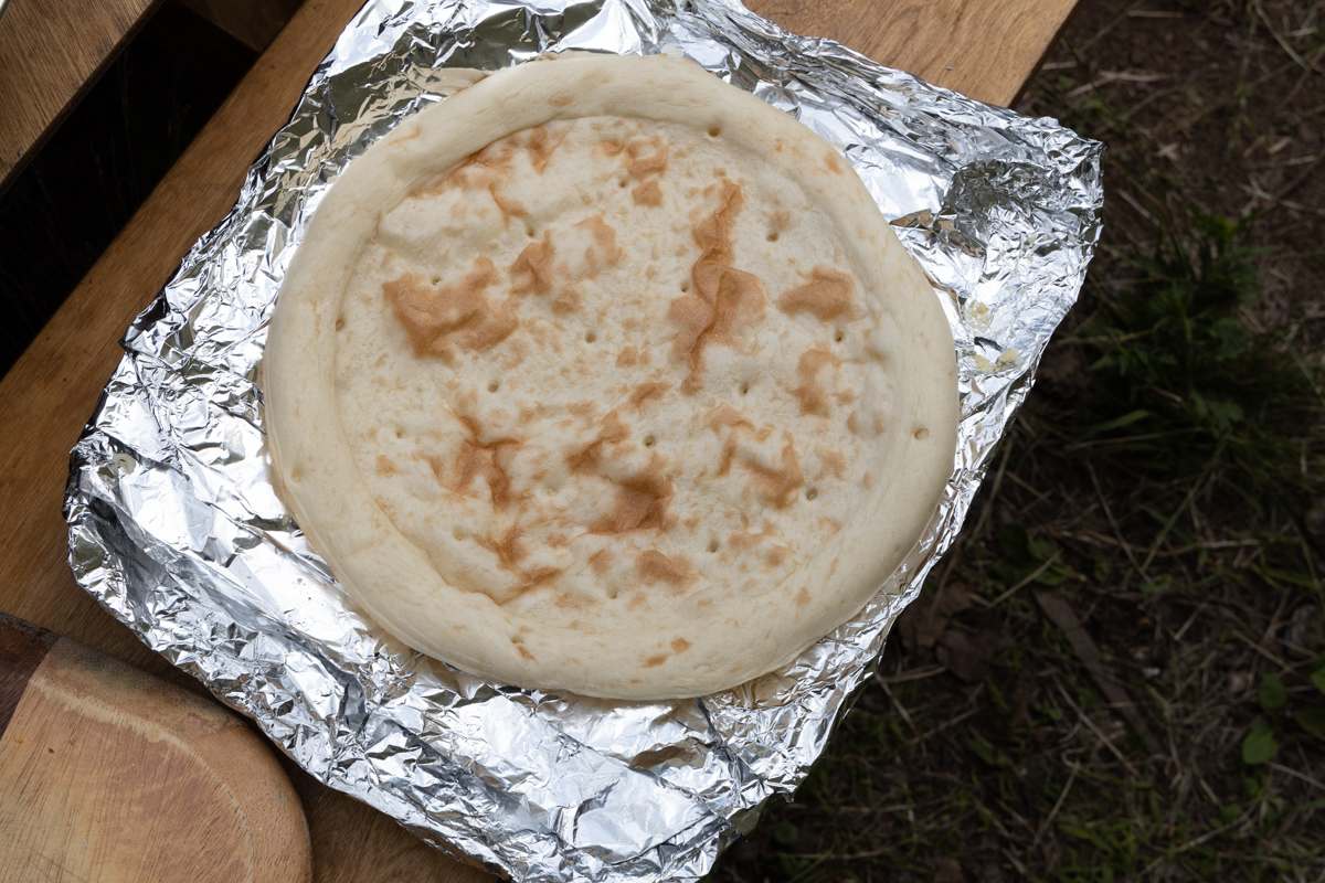 今回は薪ストーブを窯がわりに焼き上げていくので少し厚めの生地にしています。手作りの生地の場合は写真のように耳の部分を1cmほど残して生地の中心部分をくぼませておくと具材が乗せやすいです。