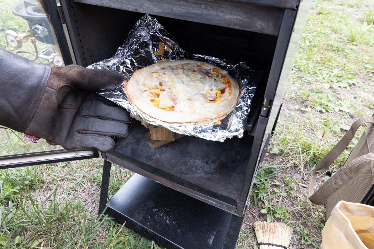 扉を開けっぱなしにするほど薪ストーブ内の温度が下がるので手早く入れるのがポイント。5分も待てばこんがり美味しい焼きたてのピザの出来上がりです!火力が強すぎないように調整したり、時々焦げていないか確認しながら焼いていくのがコツです。