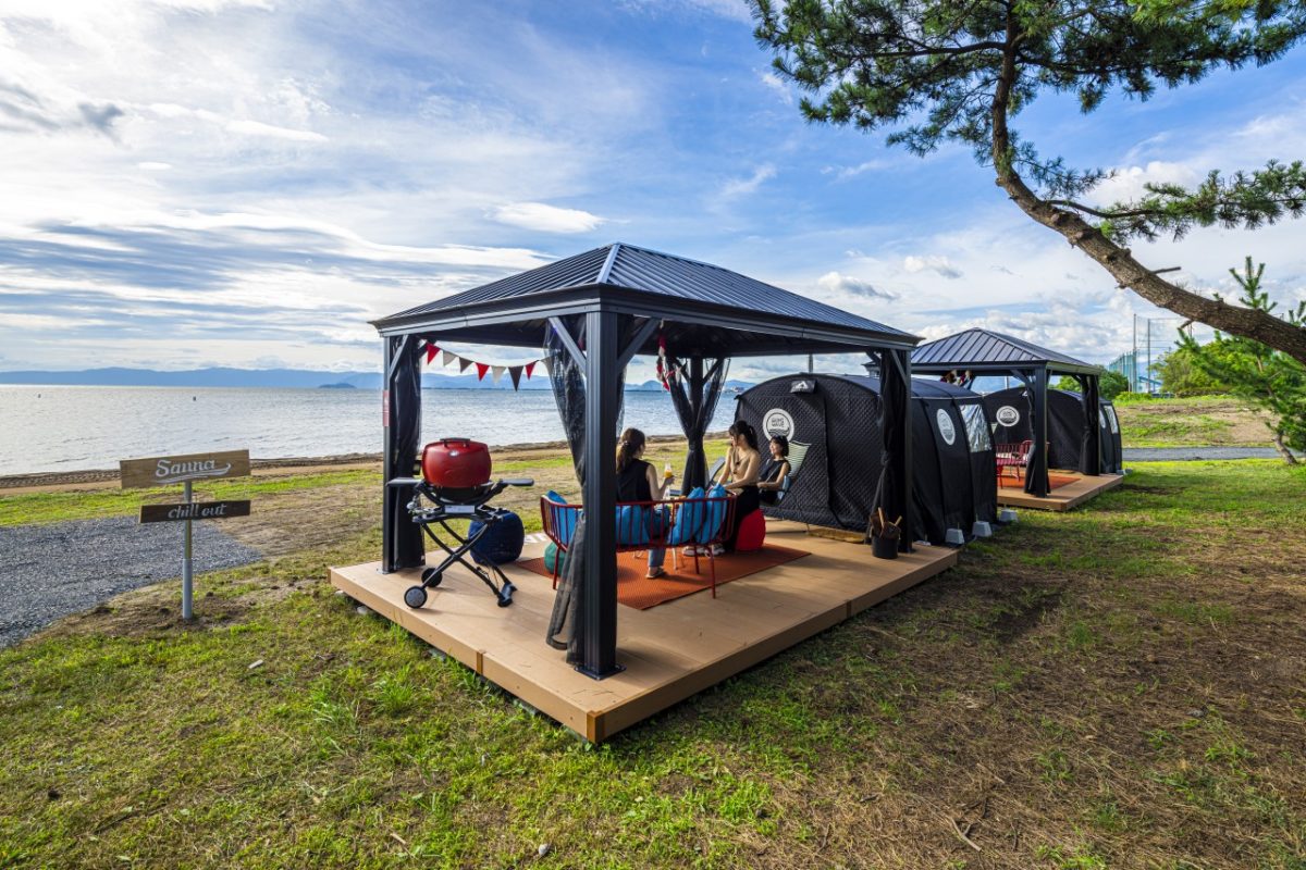 7月下旬〜8月下旬まで限定でキャンプを楽しめるのが「神明キャンプ場」。夕方になれば琵琶湖に夕日が沈む絶景が見られます。チェックイン・チェックアウトの時間は決まりがないので、ゆったりと絶景をみながらキャンプを楽しみたい方におすすめです。