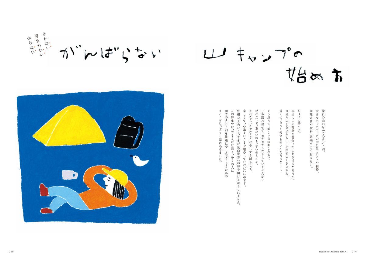 ▲朝も夜も、まるごと山を味わうテント泊。肩の力を抜くために工夫とアイデアを重ねながら、自分らしいテント泊をしているアウトドアスタイル・クリエイターの四角友里さんと、イラストレーターのこいしゆうかさんのエッセイもご紹介しています。