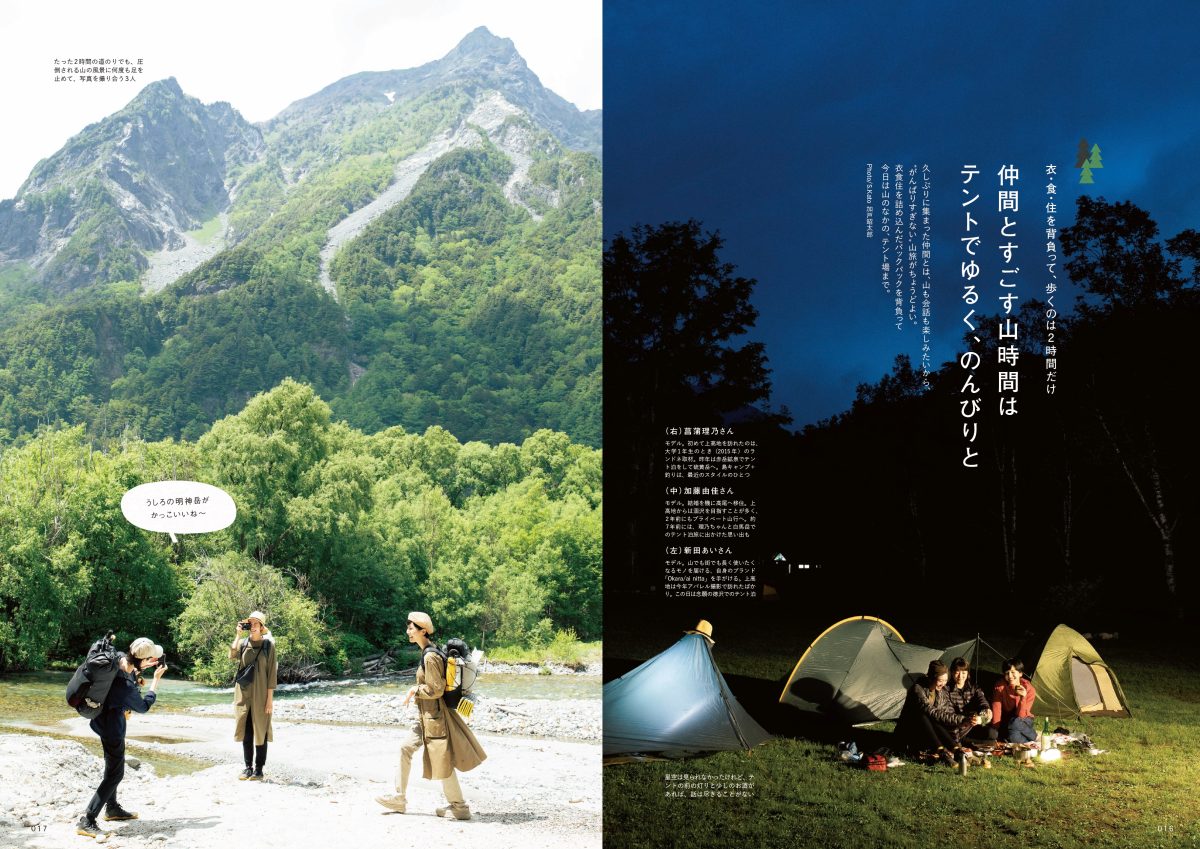 ▲久しぶりに山で再会した、モデル仲間であり山仲間の、菖蒲理乃さん、加藤由佳さん、新田あいさんは、1泊2日のテント泊装備を背負って、上高地の徳沢キャンプ場へ。「がんばらない」がテーマともあり、お昼ごはんは山小屋で、夜ごはんは現地調達したお酒とちょっとしたおつまみを。そうすることで、食材を減らすことができて荷物は軽くなるし、楽しみはどんどん増えていく。さまざまな山旅を経験した彼女たちだからこその、ゆるくて、心地よいテント泊の楽しみ方を紹介しています。