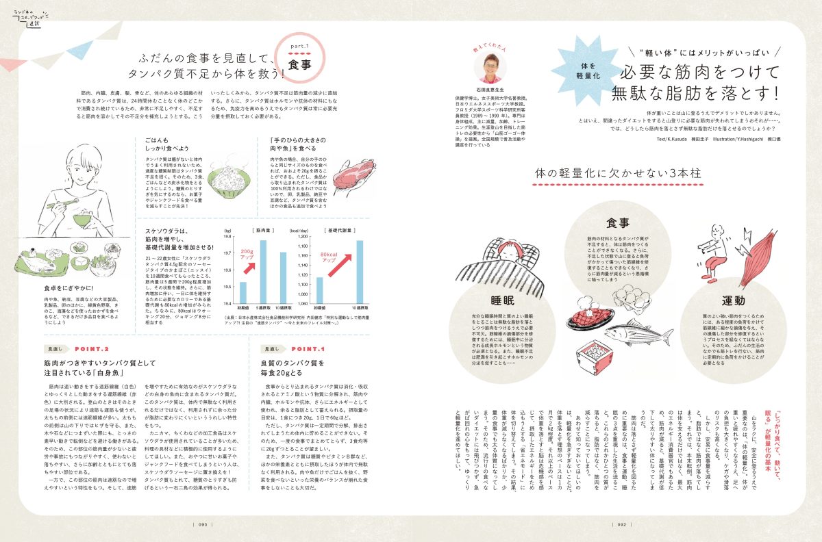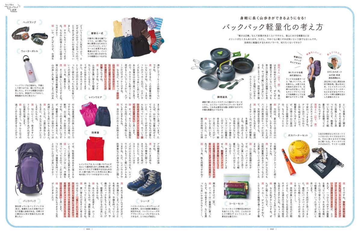▲第二特集は、自分のスタイルに合わせて考えたい「バックパック軽量化計画」です。軽量化の考え方や道具の選び方、おすすめアイテムを掲載。バックパックが軽くなったら次は自分の体も軽量化するべく、筋肉を落とさず無駄な脂肪を落とす考え方や運動方法もご紹介しています!
