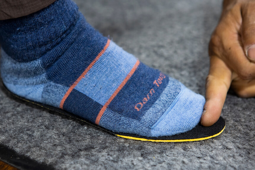 ソックスを履き、左右で大きいほうの足に合わせてサイズを選ぶ。インソールの上に足を乗せて、つま先が指一本くらい余るといい。