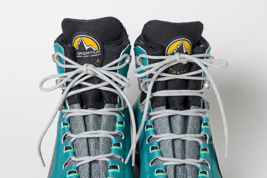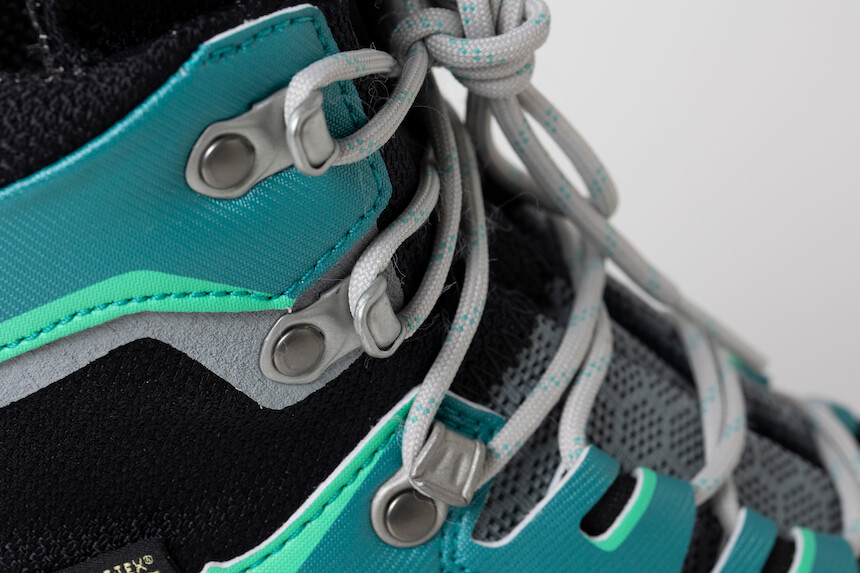 つま先側のフックはつぶれていて、ヒモをとおしたときに緩みにくくなっている。このタイプの登山靴を選ぶのもいい。