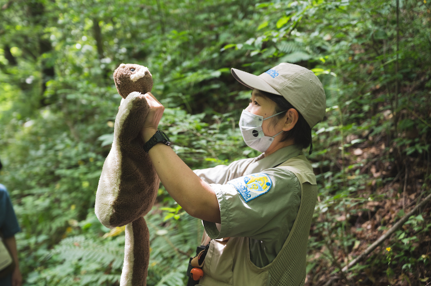 ツキノワグマの爪痕や、イノシシが川に作ったお風呂場、シカにウサギ、サルなどここで暮らしている生きものが通る獣道にも出会うことができたり、めずらしい草花もたっぷり観察することができました。