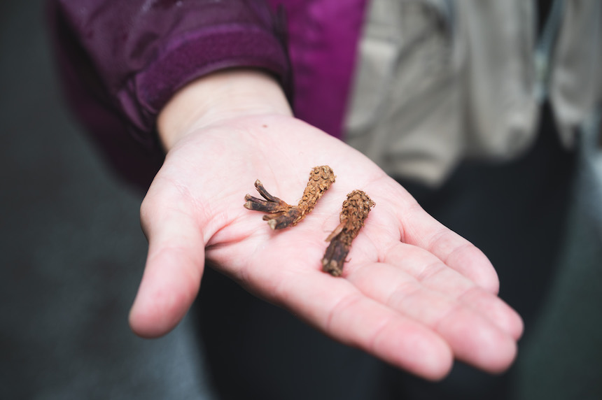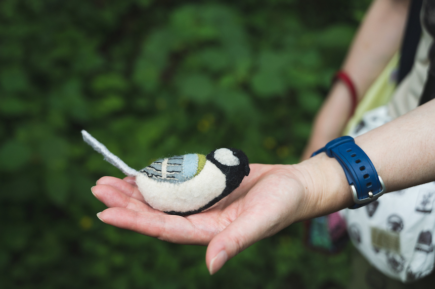 こちらはピッキオのみなさんが手作りしたという、実物大で同重量のシジュウカラ。かわいらしくて思わずみんなでパシャリ。シジュウカラは黒いネクタイが特徴で、ネクタイが細いのがメス、太いのがオスなんだそう。重さは想像よりもずっと軽く、しいたけひとつ分ほど。ガイドさんは森のことをなんでも知っていて、聞けば聞くほど新しい発見があり、どんどん森に魅了されていきます。