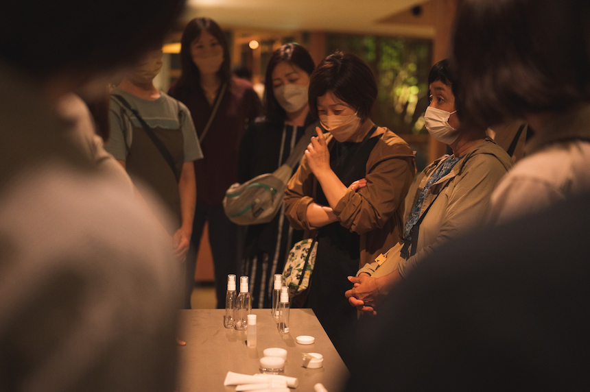 それぞれ気のゆくままに軽井沢の夜を楽しんだあとは、BEB5にて軽井沢のクラフトビールを片手に、ゆるりと夜のひと集まり。ランドネ編集部が現在開発中の山やアウトドア用のコスメ、ランドネのオンラインショップ「GOOD LIFE GOODS」で販売しているアイテム、近日発売予定の山道具のサンプルを実際に会員さんに手に取ってもらいました。