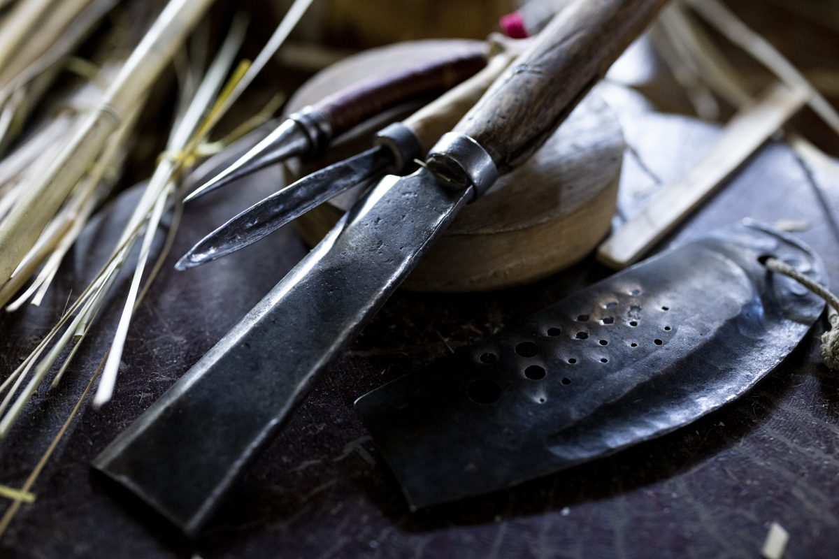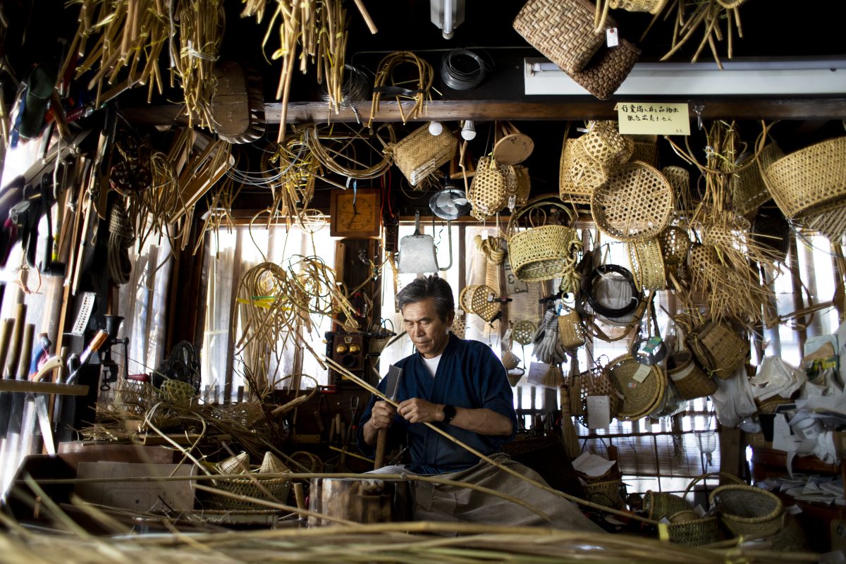 竹細工は、山へ竹を採りに行くところから仕事が始まる。なんと30㎏以上の重さの竹を背負うそうだ。山から採ってきた竹の一部を、なたで割って細いひごにし、〝さわぎり〞という自作の道具で削って整える。この行程を経てやっと、竹を編み始めることができるのだ。