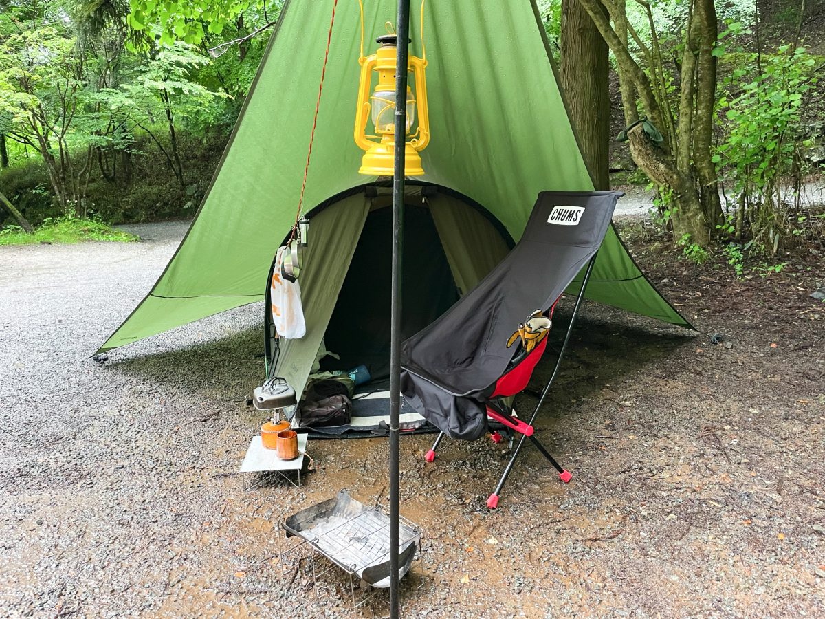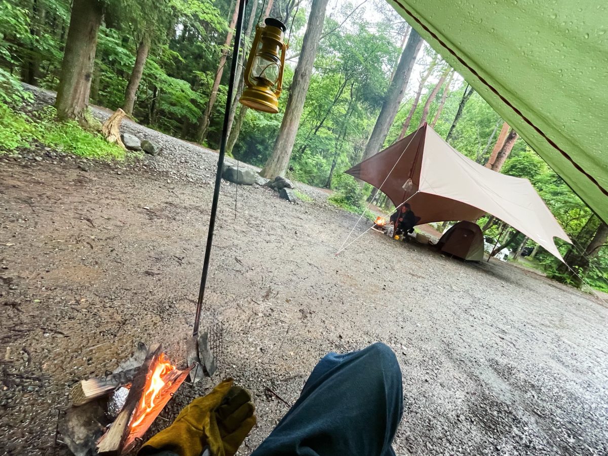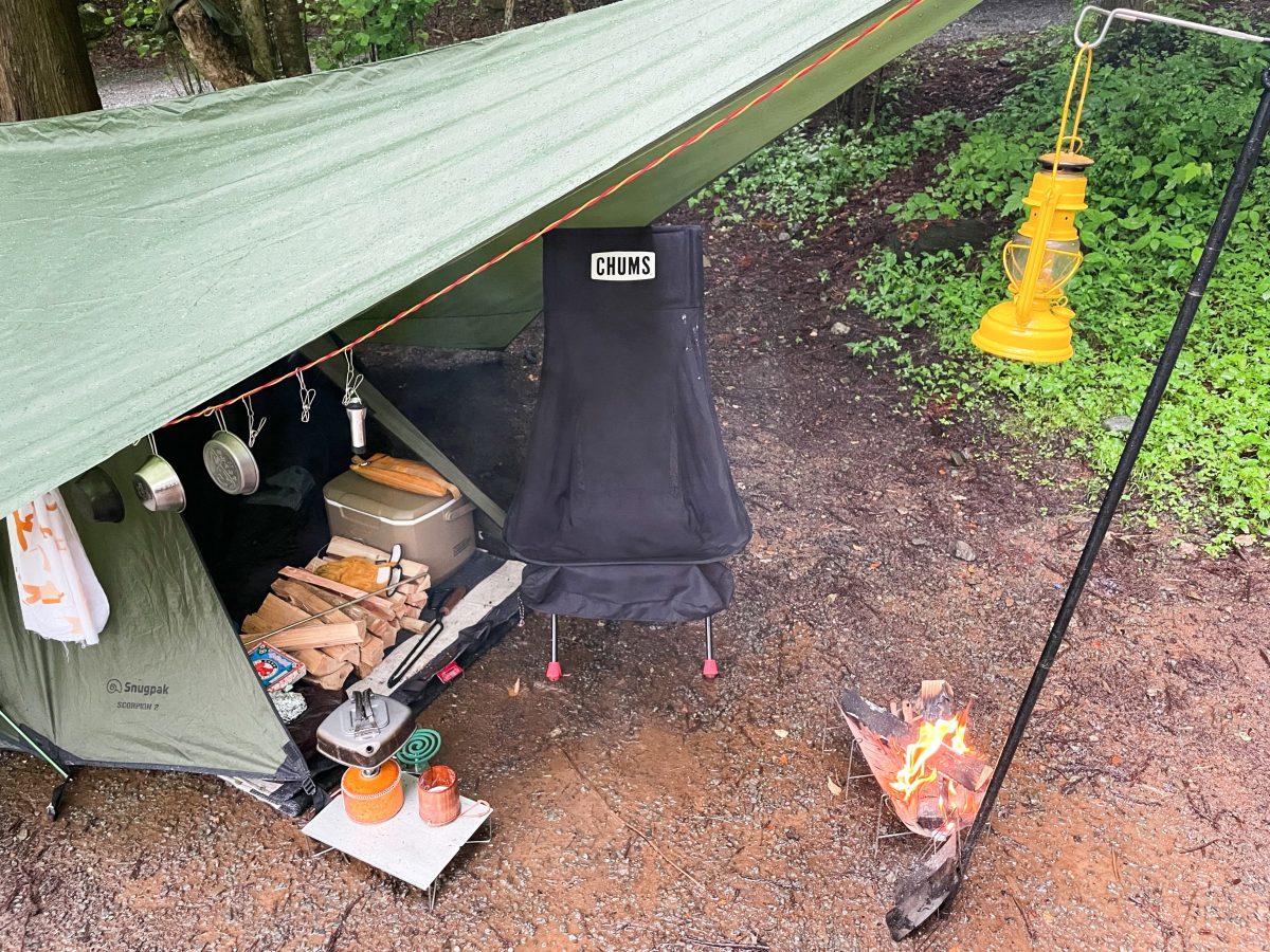 さすがに得意のお座敷スタイルもできないくらいに地面がぬかるんでいた。それでも雨だとわかっていれば、そんなに辛いものにはならない雨キャンプ。晴れたほうが良いことは間違いないが、炎天下で焚き火をすることがきつい日と、雨がしとしと降るくらいの日だと、僕の場合は良い勝負になるかもしれない。