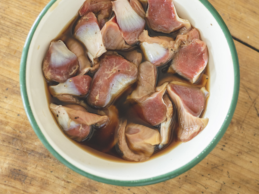 2.砂肝を水洗いしてペーパーで水気を拭き取る。麺つゆ、コーヒー、バルサミコ酢に揉み浸す(冷蔵庫でひと晩)。