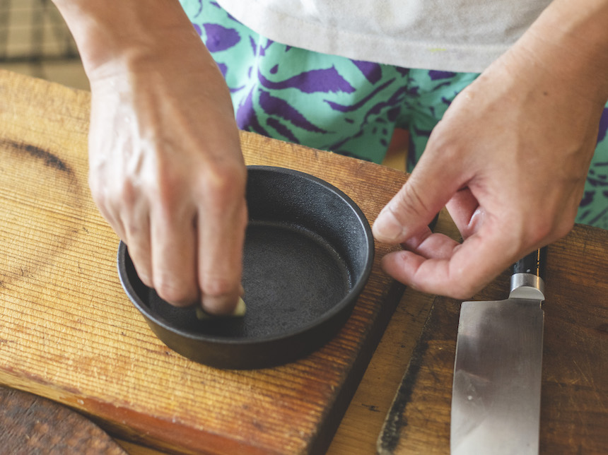 3.ミニパンの底にニンニクの輪切り断面をすりつけて香りを移す。