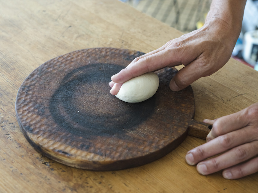 2. “まとめながら、こねる”を繰り返し、表面が張ったらボウルごとラップで覆って1時間置く。