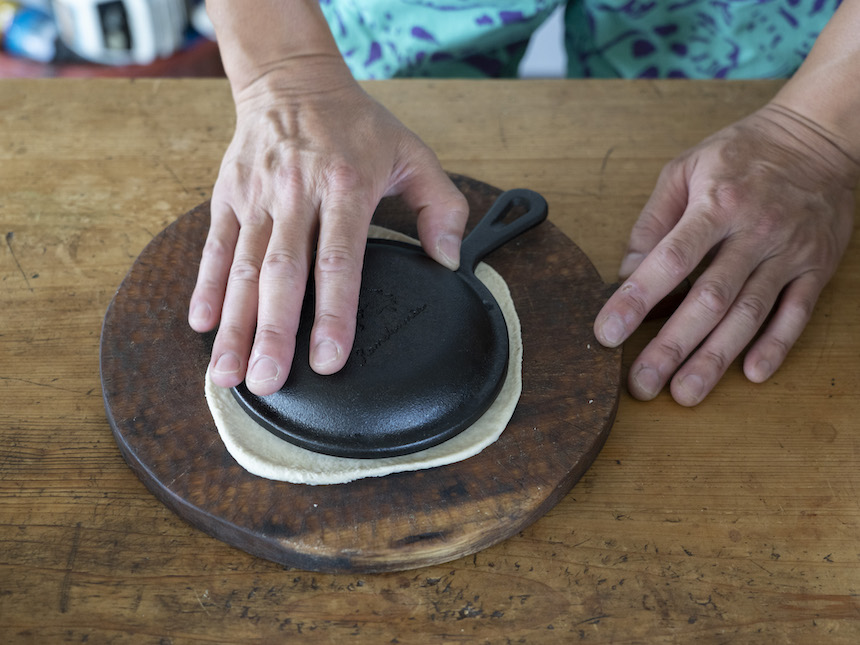伸ばした生地を蓋で切り抜くと、ミニパンサイズにぴったりの生地ができる。生地の状態によっては縮んでしまうこともある。そんなときは指で生地の端をミニパンに貼りつけるように伸ばすといい