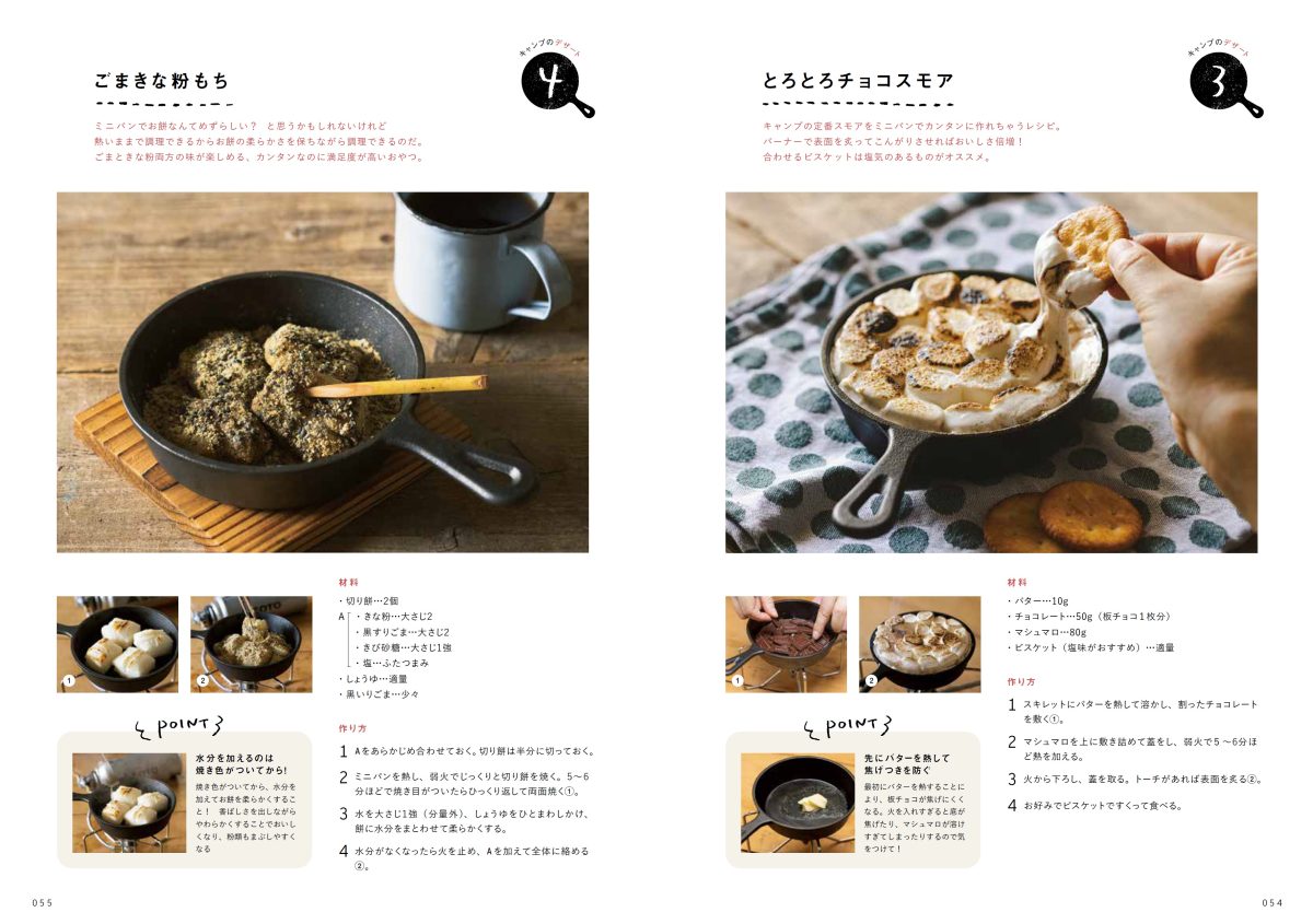 そんなオリジナルミニパンを使ったレシピを、キャンプでの朝ごはん、おつまみ、デザートの3テーマに分けてお届けしている一冊。その中身をチラっとご紹介します!
