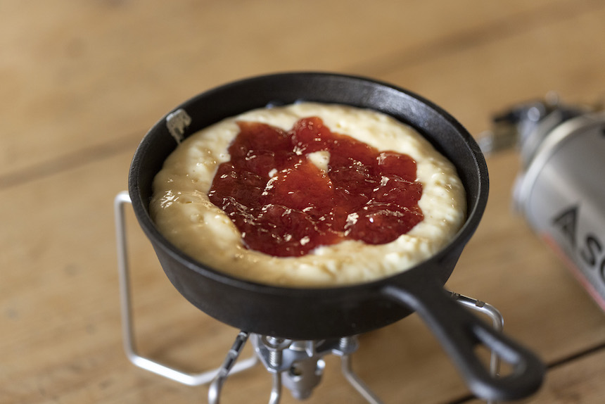 4. 全体にふつふつして生地がふくらんできたら火から離し、チーズ、ジャムの順にのせる。