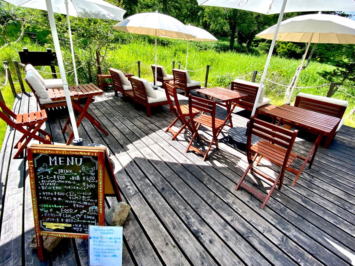 山小屋の前に設置されたテラスカフェも、映えスポットのひとつ。イスに腰掛ければ、目の前に広がる湿原や山々の景色をゆっくりと鑑賞可能。また薪ストーブのある館内のラウンジも、ホテルのロビーのような上質な空間が広がっていて、どこを切り取っても絵になること間違いなし。