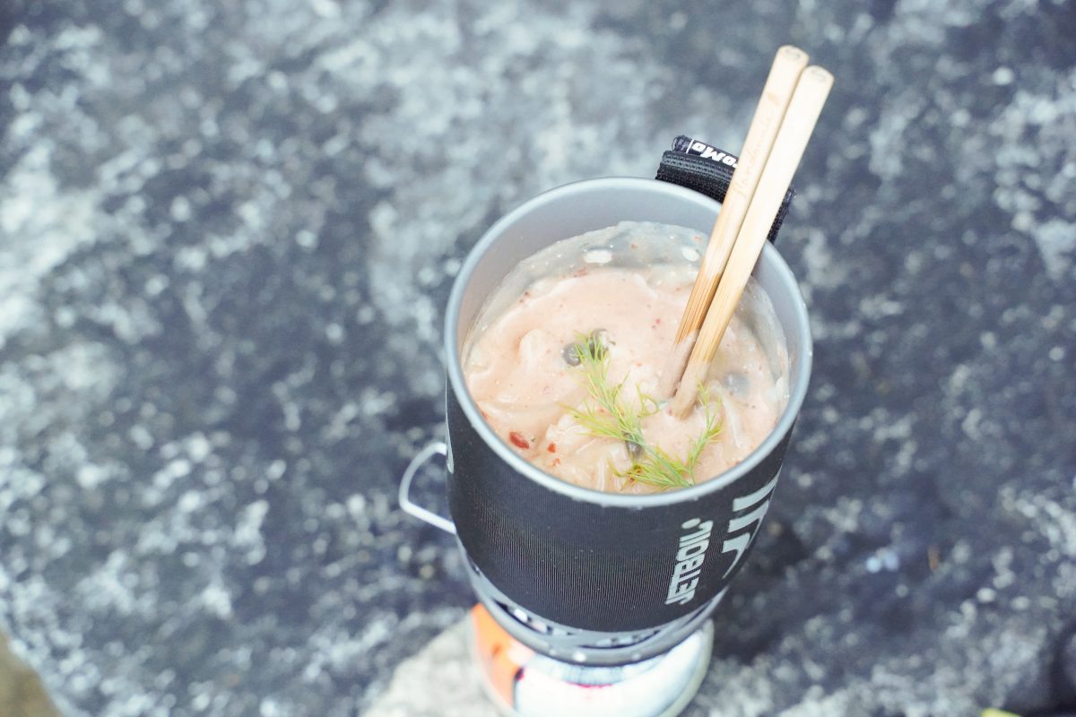 トマトポタージュと牛乳(豆乳)で、ほっこりおいしい山ごはんの完成です◎寒い季節にちょうどいいレシピで、冷えてきた夜の体に染み渡りました。