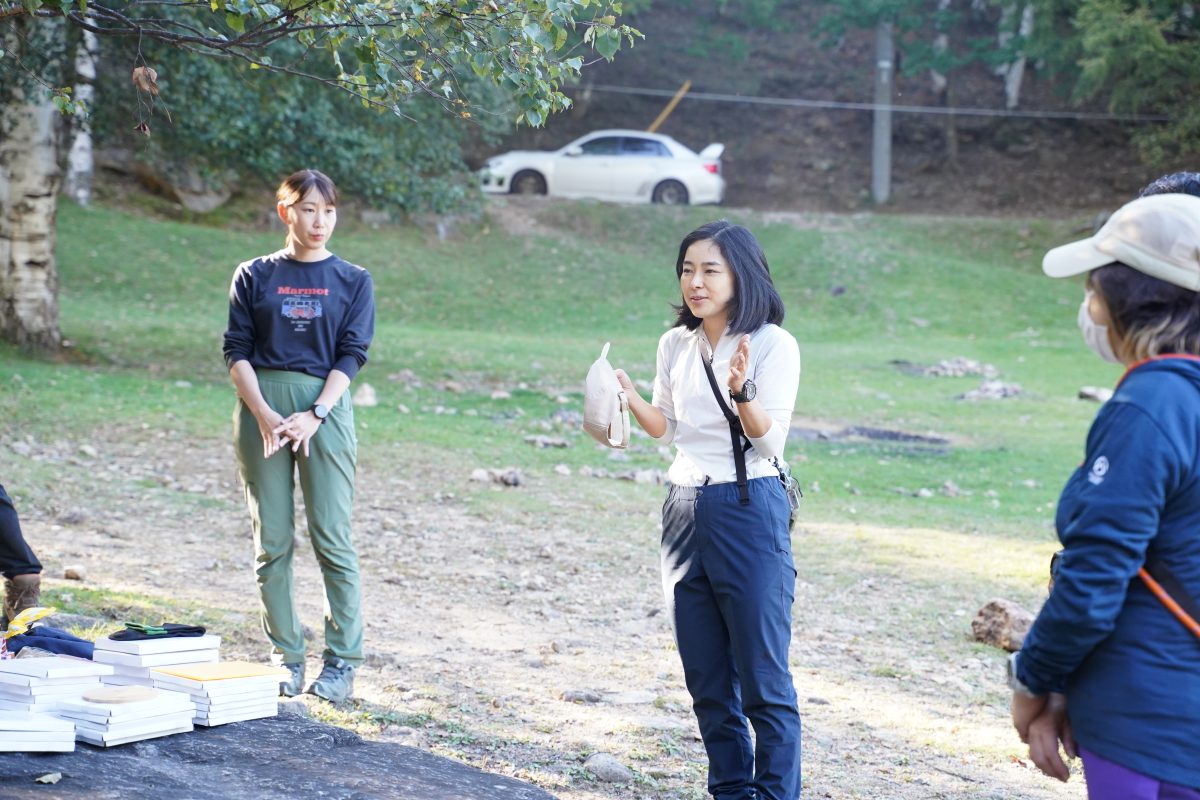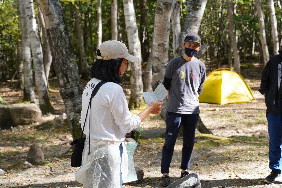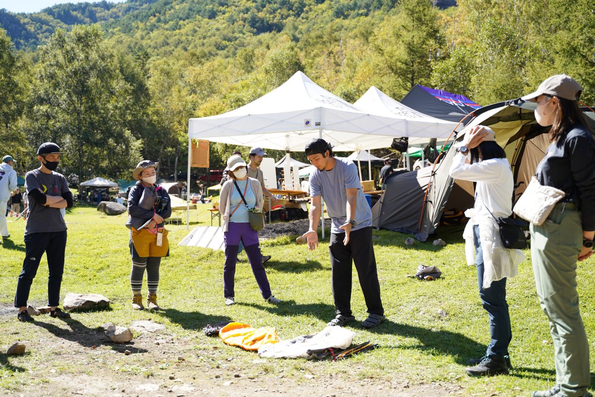 ツアーがスタートし、まず初めはテントの設営の仕方や撤収のコツを教えてもらうテント泊講座。ご参加の方は、テント泊をしたことがないという方から、久しぶりにテントを扱うから心配……という方までさまざまです。テントの扱い方や設営時に気をつけるポイント、知っていると役立つ豆知識など、実演を交えながらわかりやすく解説してもらいました!