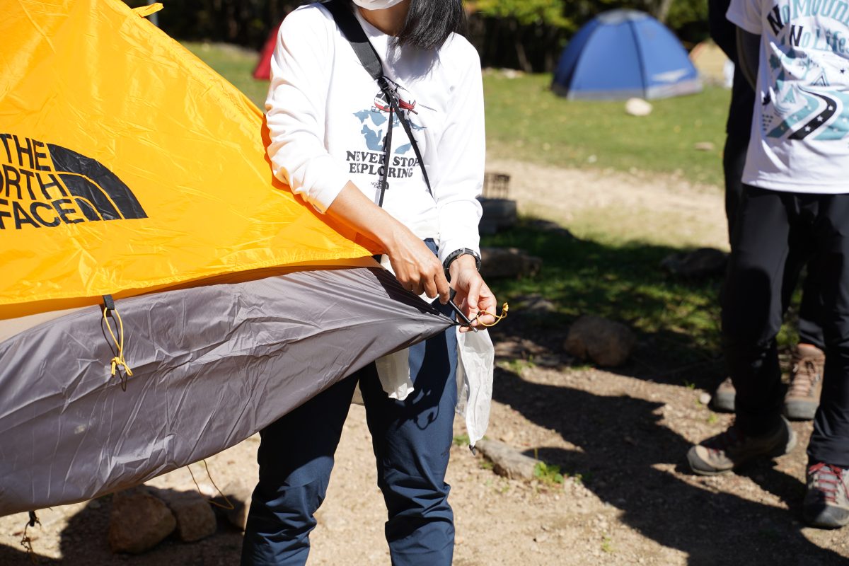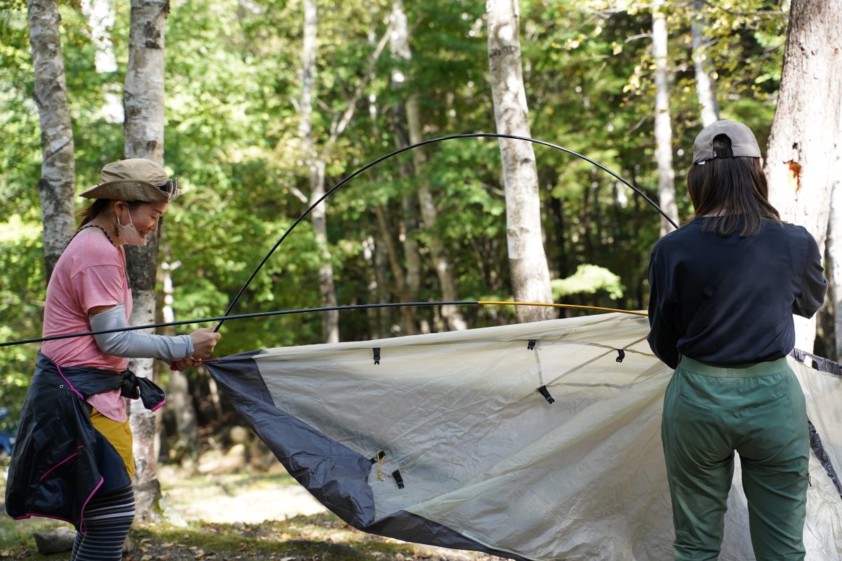テントを立てるのが初めての方も、スムーズに設営をすることができていました。雑談をしながら楽しんで作業している姿に思わずほっこり。テントの設営場所選びやペグの打ち方など、自分で実践してみることで、新た発見もあったようです!