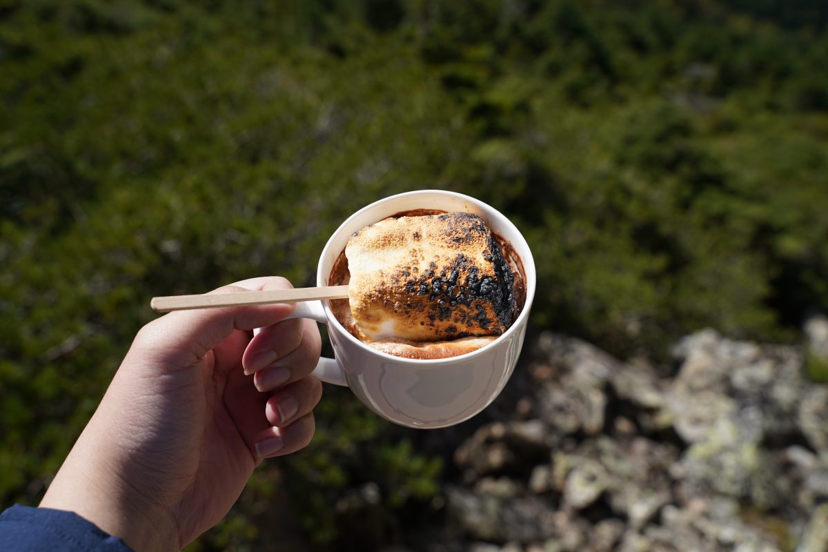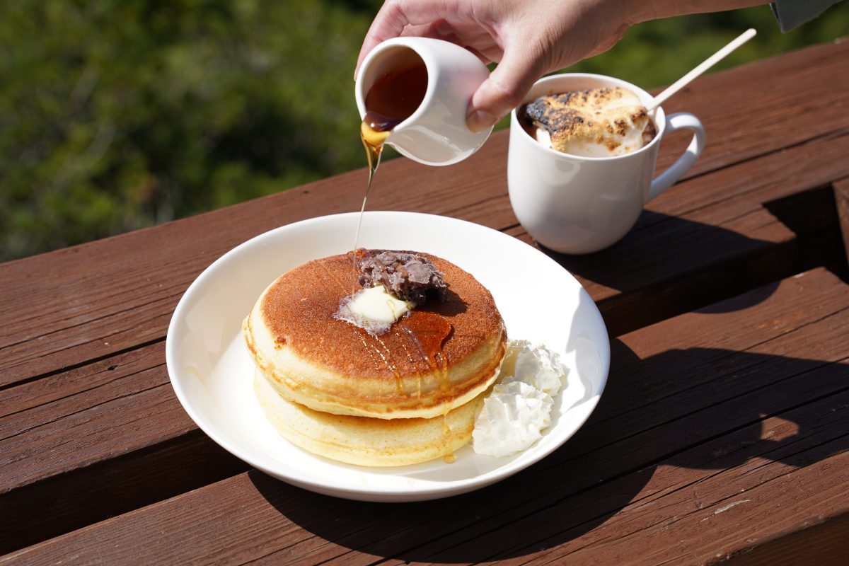 ここでは軽食メニューでおすすめのパンケーキを紹介。外はサクッとした食感で、なかはふわふわのパンケーキは、登山で疲れた身体に染み渡る!セットメニューにあるココア(大きなマシュマロ付き)は、甘党さんにぴったりなドリンクで、ふわふわのマシュマロがとてもおいしかったです!