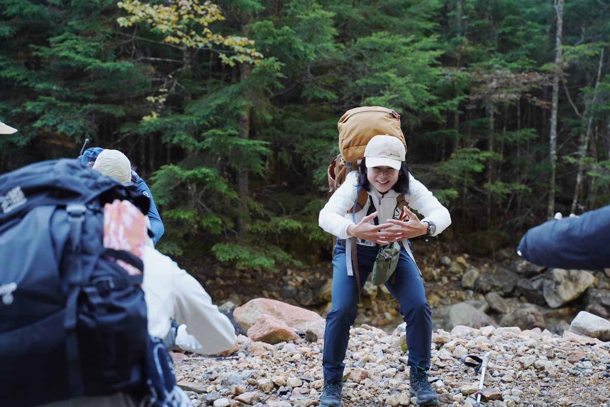 登山中に体の負担を軽減するためのストレッチを実践。休憩中に腰を下げてググ〜ッと腕を伸ばすのが、とても気持ちよかったです!