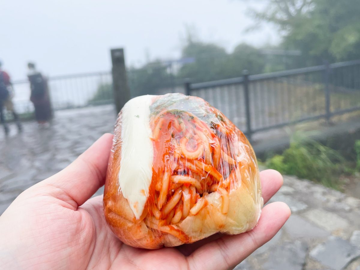 この日はあいにくの空模様。富士山は霧の中だったが、その辺は次の楽しみにするとして、山頂で軽く腹ごしらえ。飲食店もあるので、それを目的とするのも良いだろう。