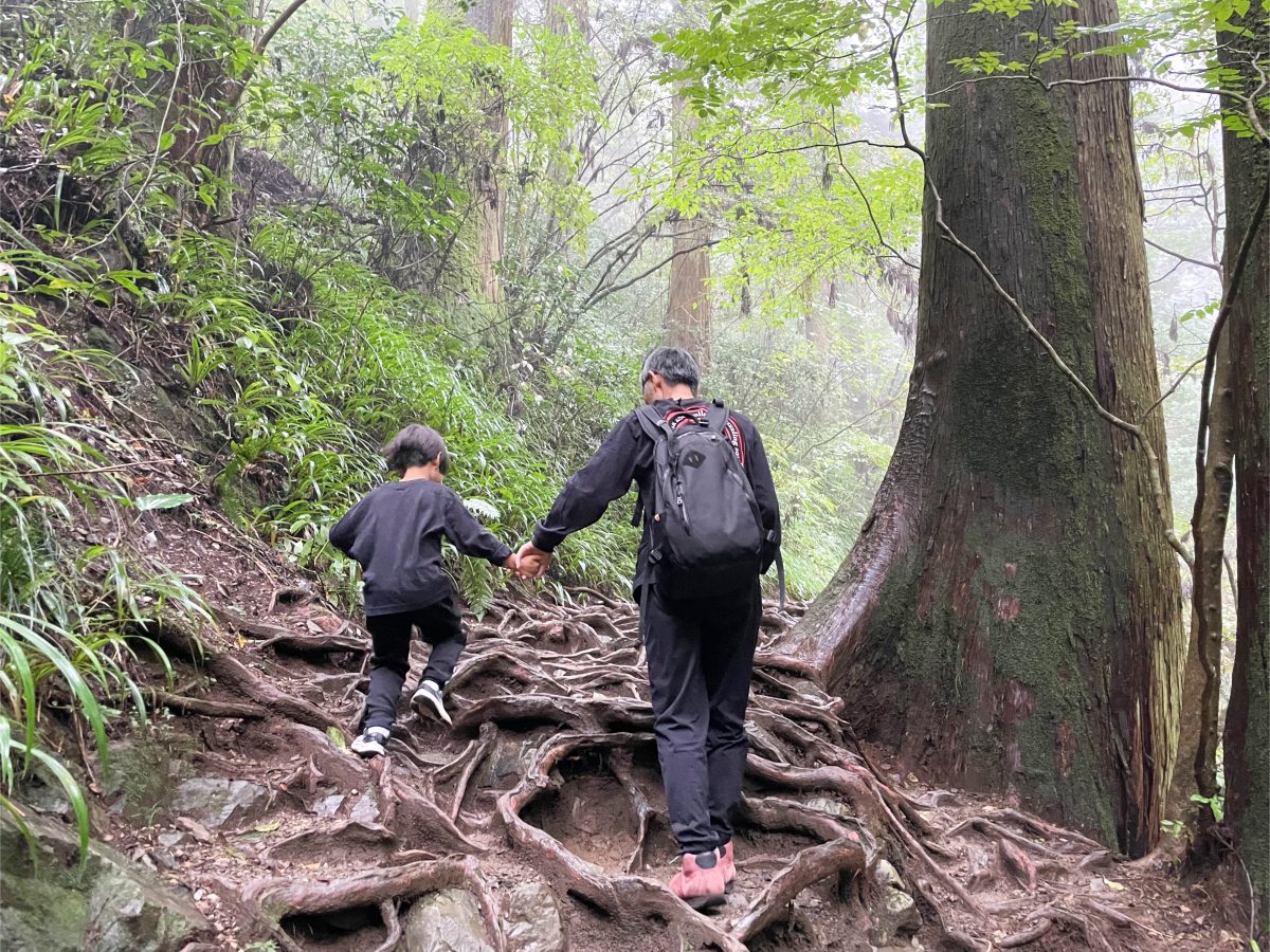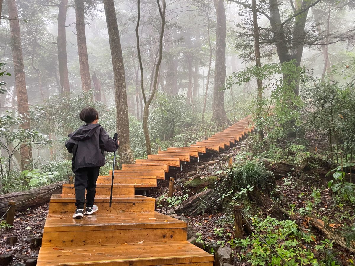そろそろ山頂かなと思ったころ、突如長い階段が現れる。永遠に続くのかと錯覚するほど長いこの階段も、「勇者」や「修行」という言葉を使えば子どもは楽しく登ってくれる。むしろ大人に厳しい階段と言えるかもしれない。