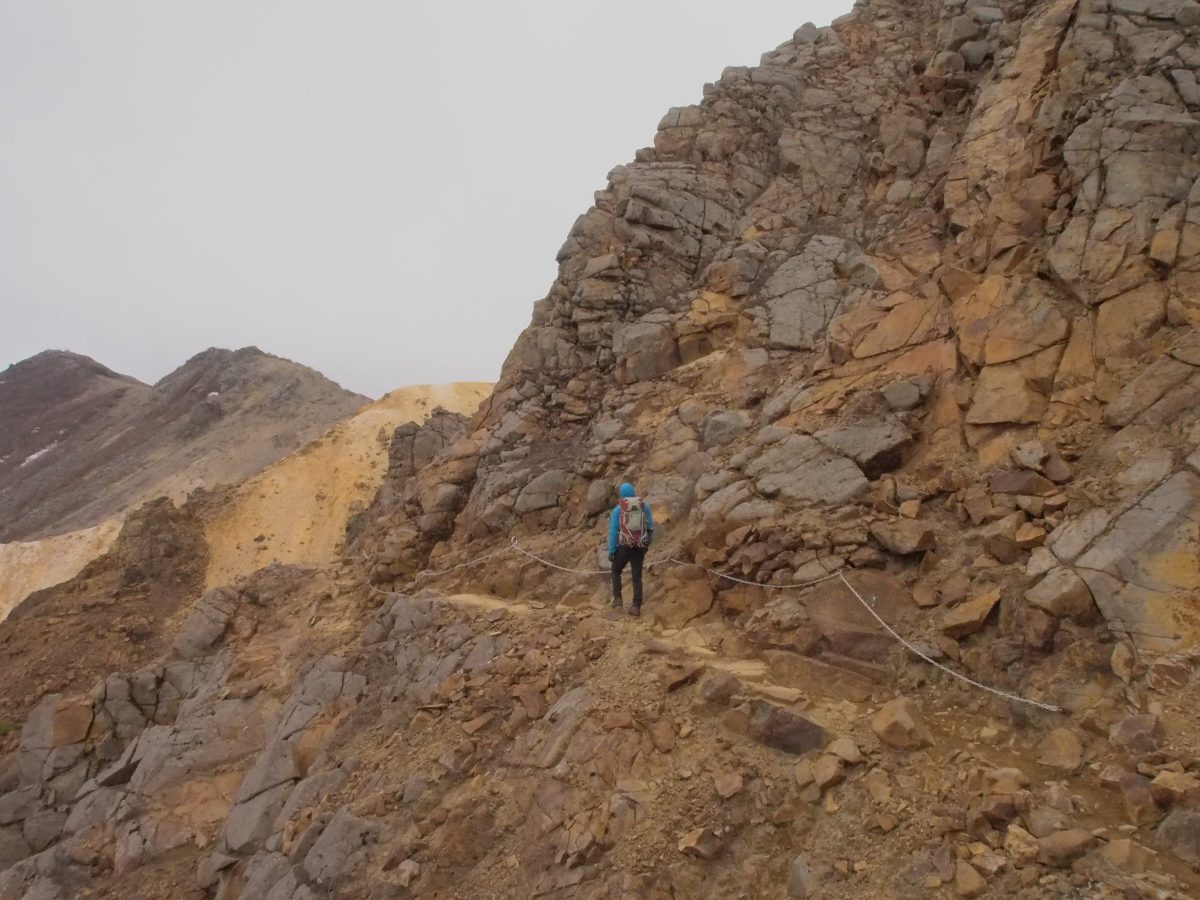 紅葉の名所である姥ヶ平を経由して、茶臼岳を見上げる牛ヶ首を通るルートも楽しいが、風が強くなく天候に恵まれた日であれば、峰の茶屋跡避難小屋を経由して朝日岳を目指すルートもおすすめ。赤褐色のゴツゴツした岩の道が続いたり、クサリ場があったりと、茶臼岳周辺とは全然印象が違っておもしろい。