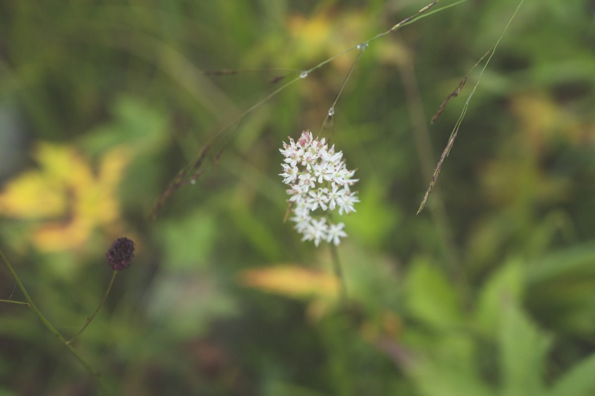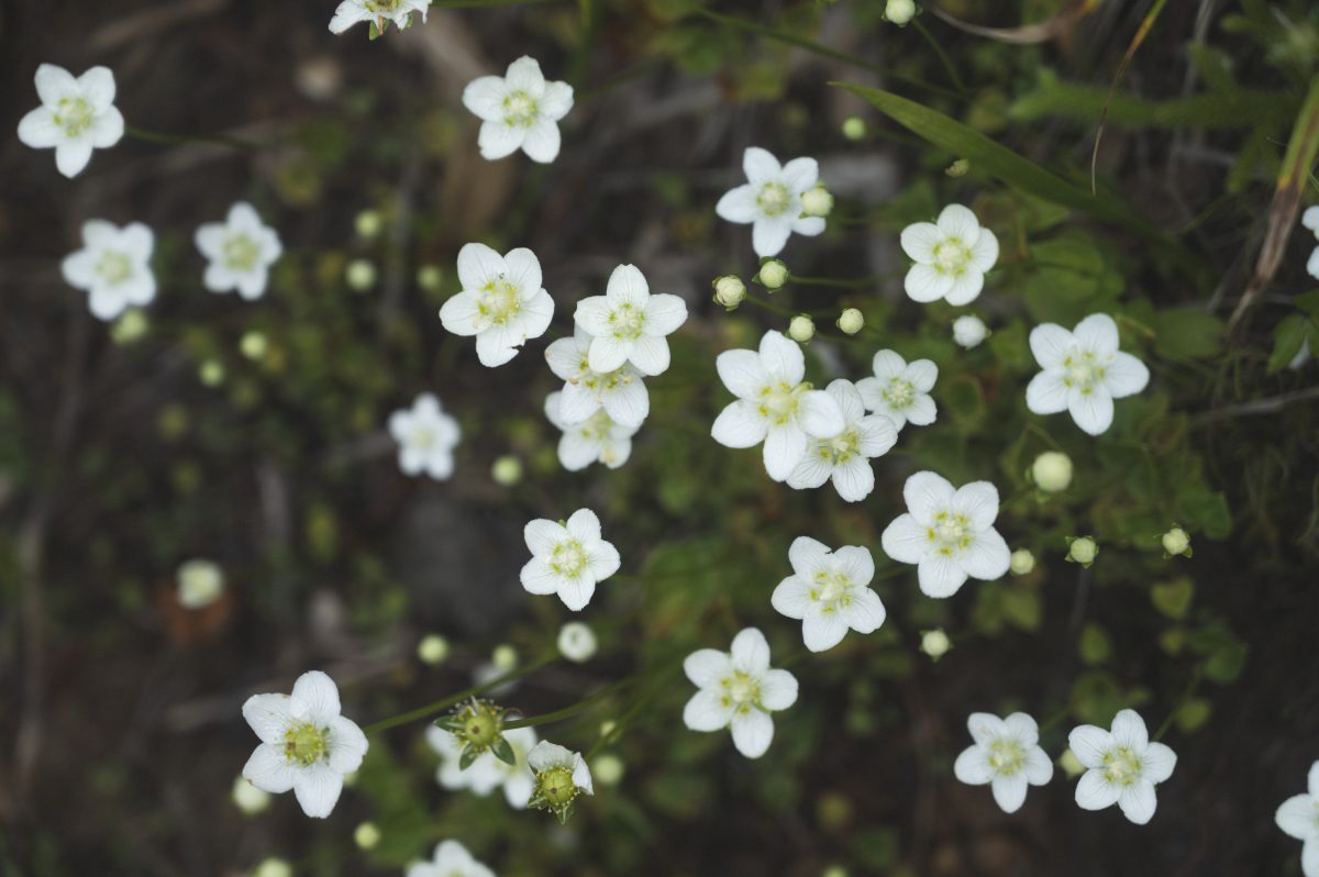 「この花の名前は?」「ウメバチソウだね」「白い花ってかわいいよね」「山並みは森飛んだけど、こういう花とかが、山で使うアイテムに描かれていたら、ほしくなるね」