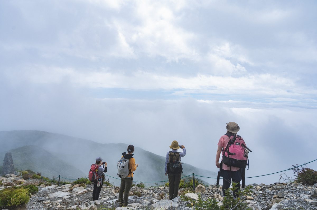 八方ケルンをすぎたころ、急に雲が流れ始めた。目の前の霧のうしろに、ちらちらと青い空が見え隠れしている。「青空だ!」「すごい!」。とても短い言葉で、ここにいる全員が喜びを表現していた。ふり返ると、ここまで歩いて来た、一本の木道が続いていた。