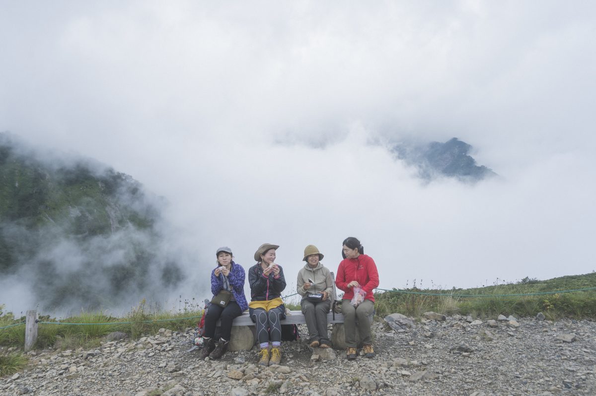 八方アルペンラインの乗り場前に集合した恵理さんと、たのしみ隊のメンバー。乗り込んだゴンドラから、好きな山の話が絶え間なく続く。この日の天気予報はあいにくの雨。いつ着ることになるのだろうと、心のなかで不安に思いながら、レインウエアをバックパックに詰め込む。